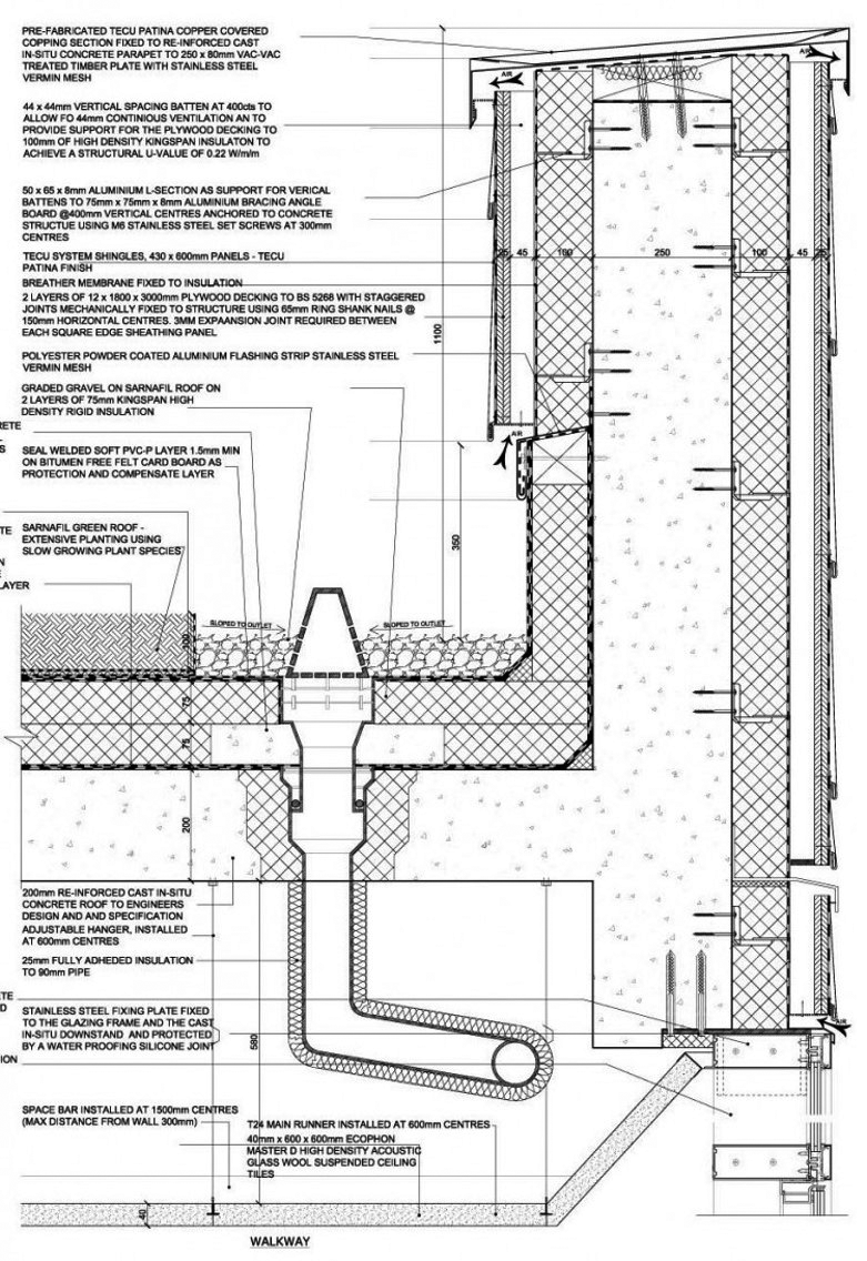 또한 매년 보수가 반복되는 녹색의 노출우레탄방수를 벗어난 도면의 그 희박한 확률로도 증명될 수 있다. 우리는 이제 지하층의 방수에 더해서 평지붕의 방수도 포기할 때가 된 것인지도 모르겠다. 아래 사 진은 노출방수를 한 후, 15년 정도의 지속적인 누수로 인해 지붕 구조체가 손상된 모습이며, 오른쪽 도면은 독일의 어느 평범한 근생시설의 평지붕 단면도이다. 심각한 문제는 현시점에서 우리나라와 독일 건축물의 공사비 차이가 거의 없다는 것이다. 우리는 무엇을 쫓고 있었던 것일까?