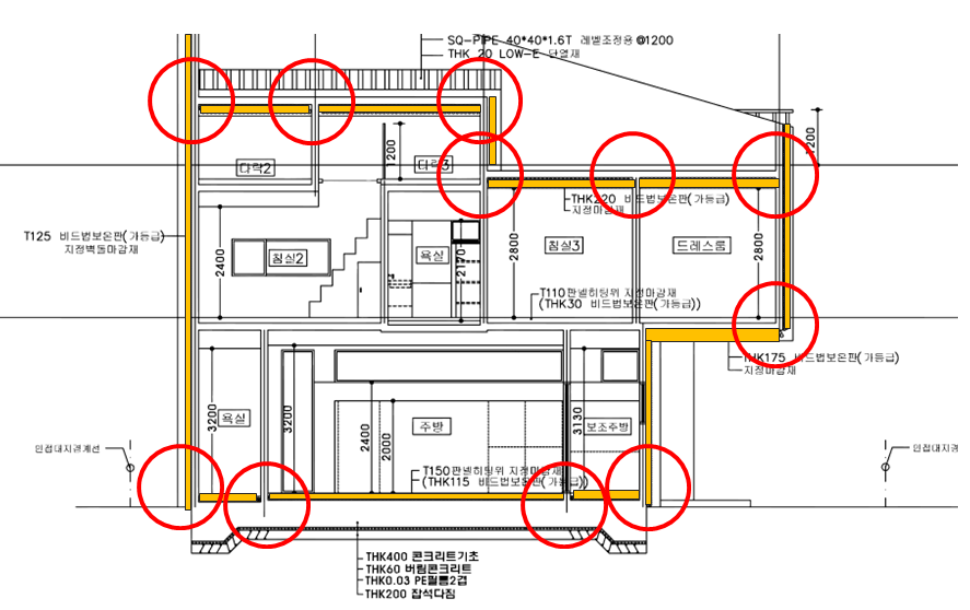 예를 들어 1970년대 이후로, 아래 도면에 표시된 열교 부위가 지금도 개선될 기미가 보이지 않는다는 것으로 방증할 수 있다.