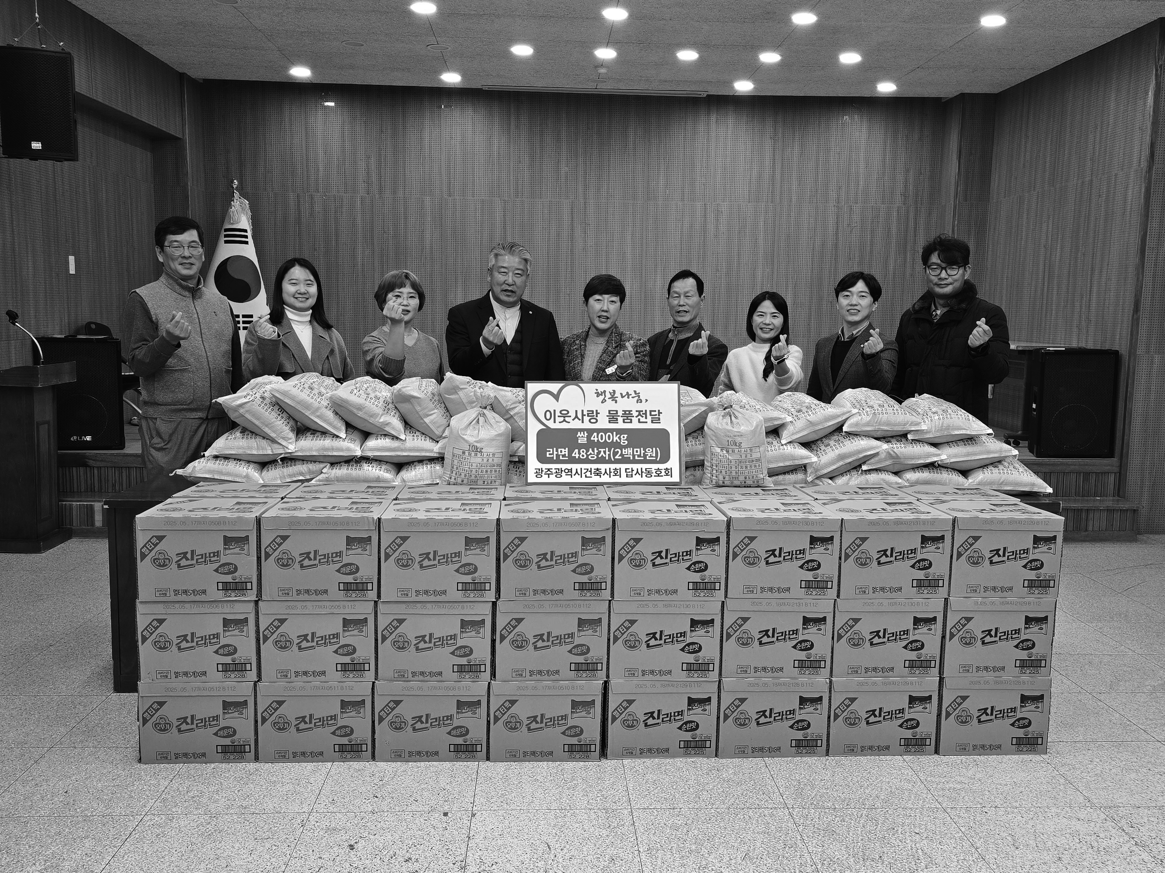 광주광역시건축사회 답사동호회는 12월 18일 광주 남구 진월동 행정복지센터를 방문해 이웃사랑 물품전달식(쌀 400킬로그램, 라면 48 상자)을 가졌다. 광주시건축사회 답사동호회 회원들은 “이번 이웃사랑 나눔 물품이 도움이 필요한 이웃들에게 잘 전달되어 따뜻하고 행복한 겨울을 보낼 수 있길 희망한다”고 말했다.