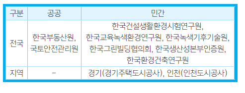 • 검토기관 : 한국에너지공단, 국토안전관리원, 한국교육녹색환경연구원, 한국부동산원, 한국생산성본부인증원, 한국환경건축연구원