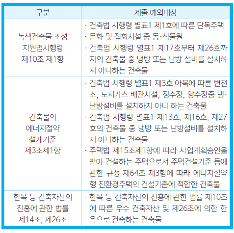 ※ 위의 건축물 용도 중 단독주택과 동·식물원을 제외한 나머지 용도의 건축물은 냉방 또는 난방 설비를 설치하지 않은 경우 에너지절약계획서 제출 예외 대상에 해당하며, 건축물의 에너지절약설계기준 제3조 제3항에 따라 냉방 또는난방설비를 설치하고 냉방 또는 난방 열원을 공급하는 대상의 연면적의 합계가 500㎡ 이상인 경우, 에너지절약계획서 제출대상에 해당됨.