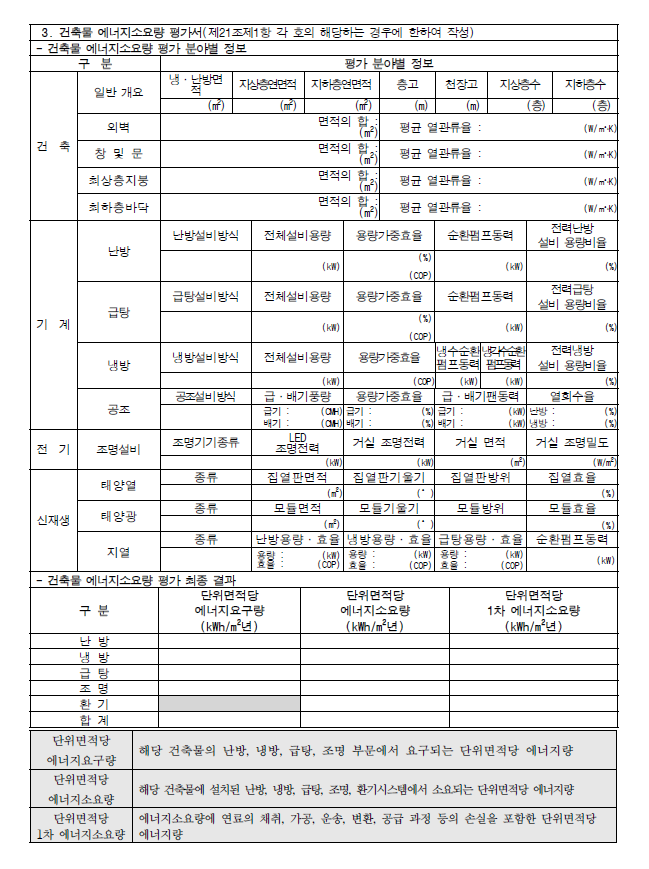 「건축법 시행령」 별표 1에 따른 업무시설 및 교육연구시설 중 연면적의 합계가 3천㎡ 이상인 건축물을 신축 또는 별동으로 증축하는 경우, 1차 에너지소요량 등을 평가하여 건축물 에너지소요량 평가서를 제출하여야 한다.