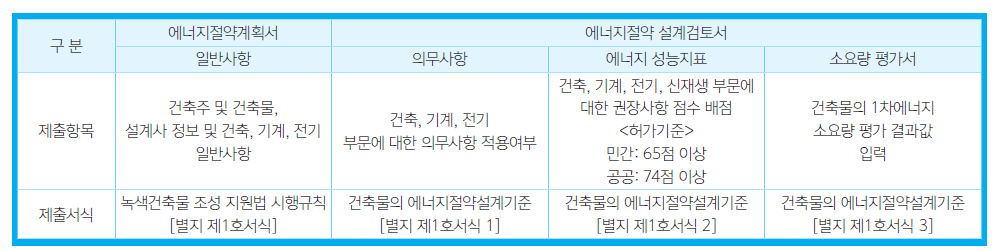 에너지절약 설계 검토서는 에너지절약 설계기준 의무사항 및 에너지성능 지표, 에너지소요량 평가서로 구분되며, 에너지절약계획서를 제출하는 자는 에너지절약계획서 및 설계 검토서의 판정자료를 제시하여야 한다. 다만, 자료를 제시할 수 없는 경우에는 부득이 당해 건축사 및 설계에 협력하는 해당 분야 기술사(기계 및 전기)가 서명·날인한 설치예정확인서로 대체할 수 있다.