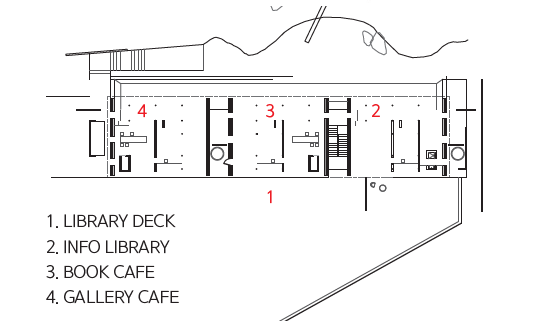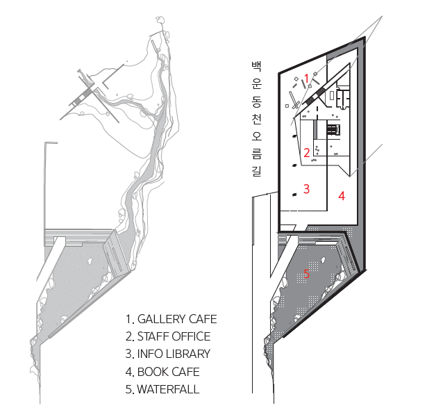 청운문학도서관의 입구로서 백운문학공원의 입구가 된다. 무겁지 않은 여러 프로그램들을 수용하면서 작은 책집으로서의 휴게소가 된다. 만남의 장소로서의 친근함이 배려된다. 수공간들을 연계하면서 지형 위에 떠 있고 지형 속으로 스며든다.