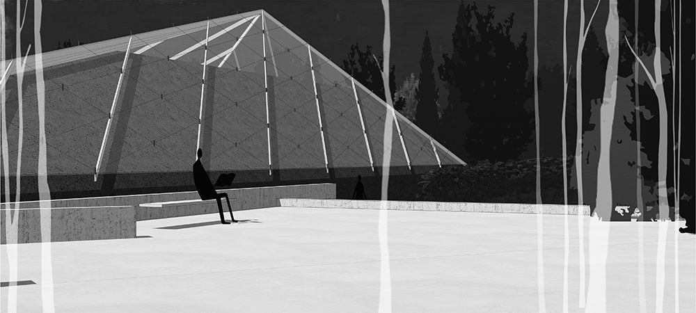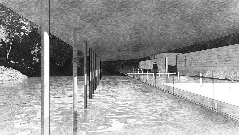 물을 담고 순환하는 저류지. 수면과 그늘지붕이 낮과 밤의 빛으로 상호 간섭하는 침묵의 공간. 사색의 프롬나드를 풍경으로 회화한다.