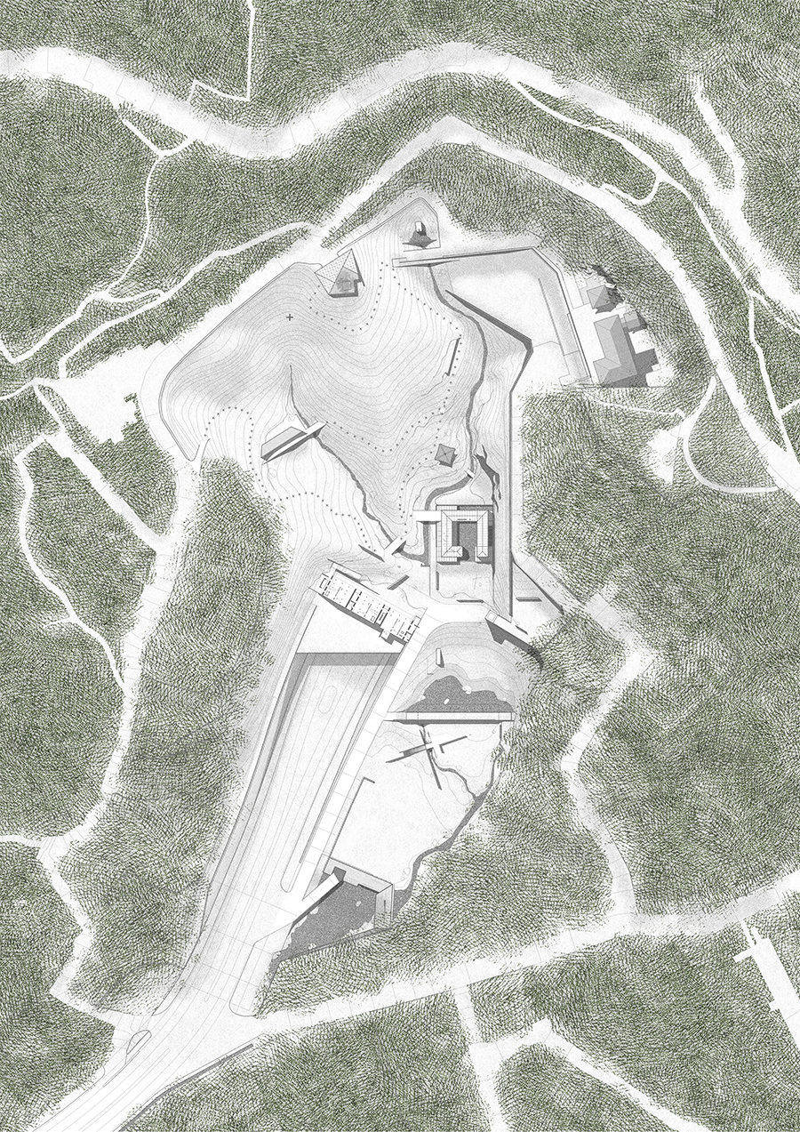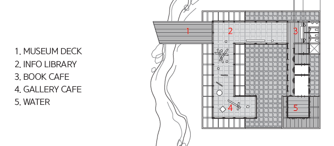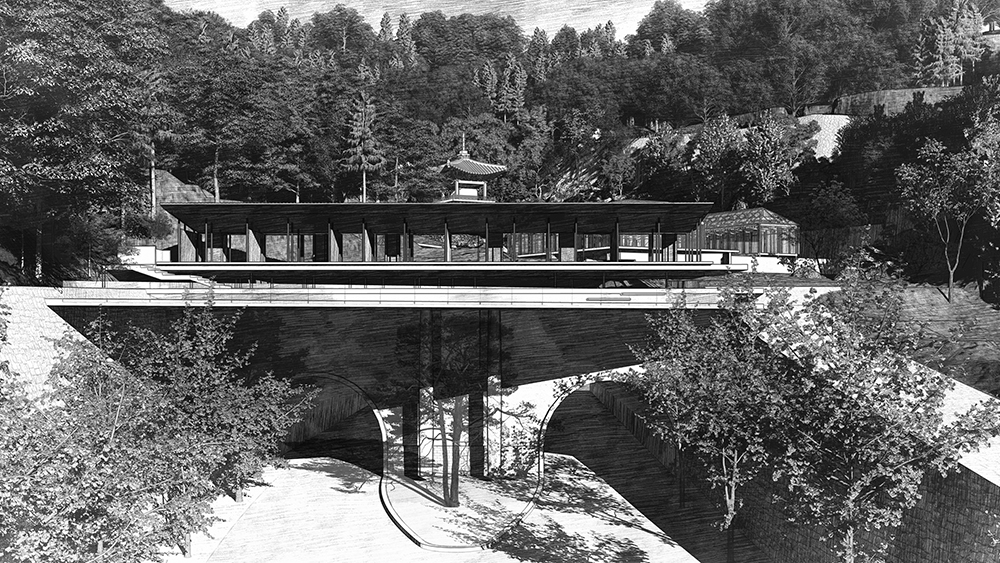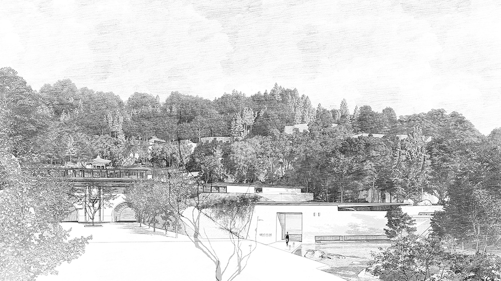 고증을 거쳐 구조를 복원하고 공간을 재현한다. 복원과정 또한 학술적 기록으로 보존된다. 집터는 물을 담는 저류지로서 수공간을 형성한다. 일부분은 투명한 외피를 통해 안과 밖을 풍경으로 겹치게 하고 숲지붕, 하늘지붕을 천장으로 치장하고 암벽과 수벽을 풍경벽으로 인도한다.