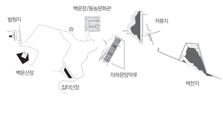 영역의 최상부에 발원지수공간1가 계획되며 몽룡정과 각자바위수공간2, 백운장수공간3, 저류지수공간4, 영역의 초입에 벽천지수공간5가 계획된다. 수공간으로 이루어지는 파빌리온, 풍경으로서의 걸음길, 다섯개의 물집으로 계획된다.