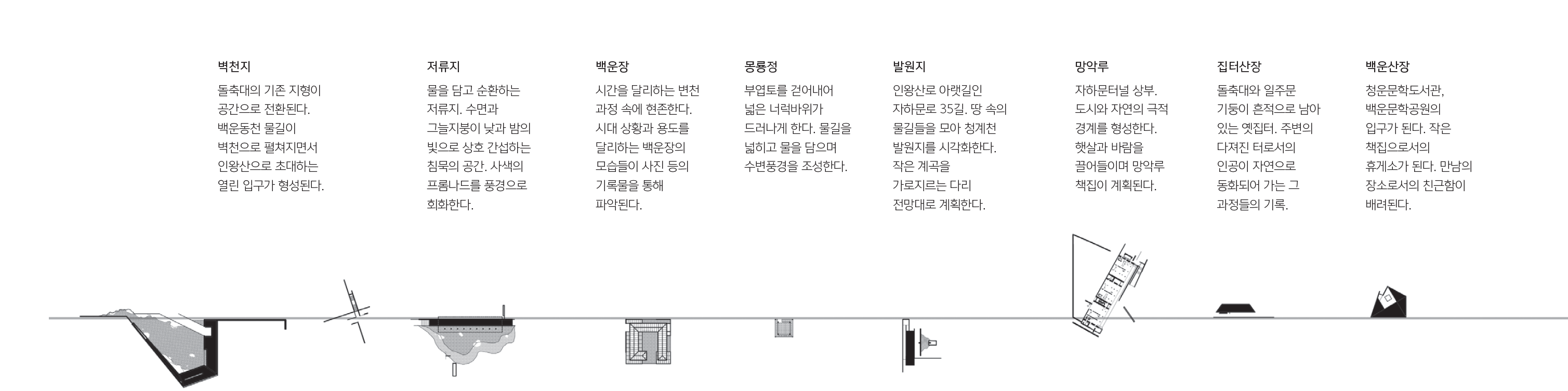 청계천 원류로서의 물길풍경을 재현하면서 공원도서관, 숲속 도서관으로서 책 읽는 공원인 백운문학공원으로 계획된다. 기존의 물길과 지형, 그리고 집터를 따라 다섯 개의 물집과 세 개의 책집이 걸음길을 형성한다.