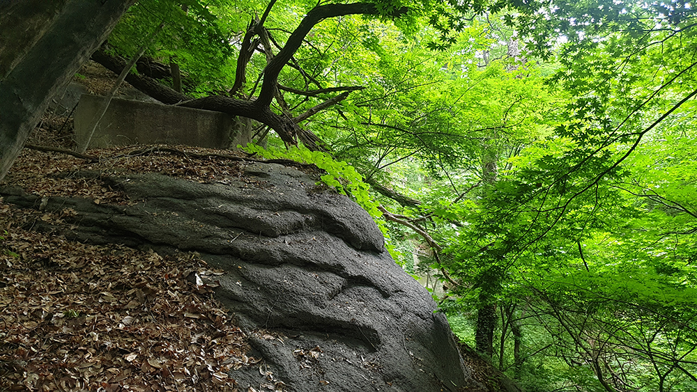부엽토, 낙엽들을 걷어내어 겸재 정선의 바위산, 풍광을 드러낸다.