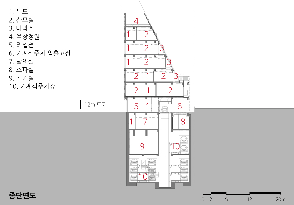 주차와 피난동선의 배치도 산모실 배치 못지않게 디자인에 중요한 영향을 미쳤는데, 사이트의 특성상 램프를 이용한 자주식 주차에는 제약이 따랐다. 따라서 빠른 주차와 충분한 대기공간이 확보될 수 있는 시스템의 기계식 주차를 적용했고,<사진 5> 빠르고 직관적인 피난이 가능하도록 건축물의 양 끝에 비상계단을 두었다. 2대의 엘리베이터는 기다란 건축물을 3등분 하여 사용자가 편리하게 이용할 수 있도록 하는 한편 구조적인 역할을 하도록 계획했다.