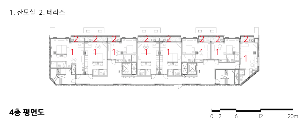 산모실과 이를 연결하는 복도의 배치는 남측의 번잡한 도로 상황과 북측의 공동주택과의 프라이버시 문제 사이에서 중요한 선택의 문제였다. 산후조리 및 안정을 위해서는 남측 도로변의 정돈되지 않은 외부 환경과 직접적인 태양광은 최대한 걸러내고, 인접한 공동주택과는 각각의 프라이버시를 확보할 필요가 있었다.<사진 9> 건물이 빽빽한 도심 속이지만 산모와 공동주택 거주자 모두 회색의 건물이 아닌 초록의 작은 정원을 바라볼 수 있도록 일조사선에 의해 생기는 경사면에 적극적으로 테라스를 설계하고 조경을 계획했다.<사진 3, 7> 그리하여 산모실은 북측에, 복도는 남측에 배치하는 것으로 결정했고, 다행히 발주처도 이런 해결책에 공감해 주었다.