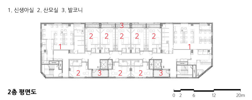 사이트는 오랜 기간 지상주차장으로 사용되던 부지로 남측 12미터 도로에 동서로 길쭉하게 접하고 있으며, 북측으로는 공동주택이 인접해 있다. 따라서 산모실의 배치와 주차 및 피난동선이 중요한 디자인 이슈가 되었다.<사진 6, 14>