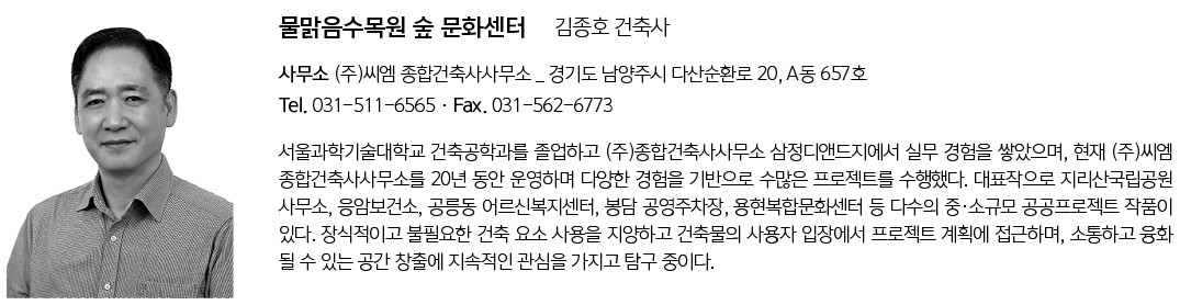 | 물맑음수목원 숲 문화센터 설계자 | 김종호 _ (주)씨엠 종합건축사사무소 건축주 | 남양주시 감리자 | 서우건축사사무소 시공사 | (주)욱승종합건설 설계팀 | 최웅, 박승호 대지위치 | 경기도 남양주시 수동면 지둔로307번길 47-4 주요용도 | 문화및집회시설(전시장) 대지면적 | 117,061.00㎡ 건축면적 | 781.30㎡ 연면적 | 998.90㎡ 건폐율 | 0.67% 용적률 | 0.86% 규모 | 2F 구조 | 철근콘크리트구조 외부마감재 | THK30 화강석버너구이 내부마감재 | 친환경페인트 설계기간 | 2020. 04 - 2022. 05 공사기간 | 2022. 10 – 2024. 05 사진 | (주)씨엠 종합건축사사무소 구조분야 | CK구조엔지니어링 기계설비·전기·소방분야 | (주)태영EMC |