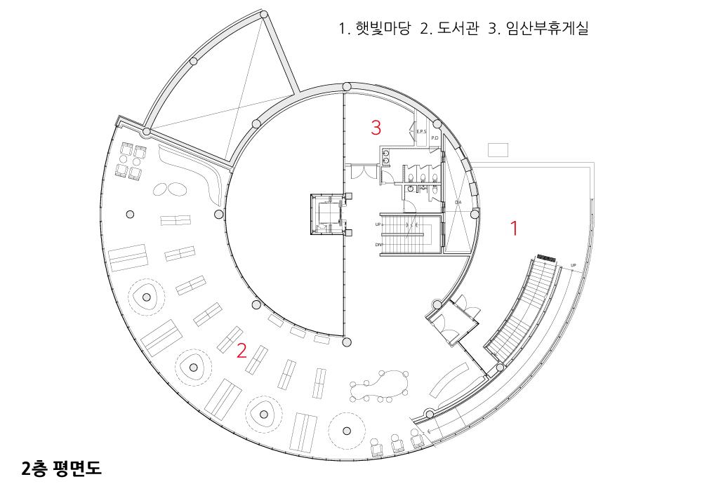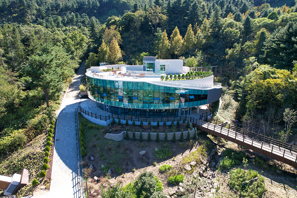 대지의 지형적 특성에 부합하는 반원형 매스(Mass)계획, 내부공간에서 자연으로의 시각적 확장과 곡선형 외관 이미지로 친근함을 구현했다. 내·외부 유기적 시각 연계를 위한 전면 통창 계획은 개방감과 적극적인 조망과 채광을 제공한다. 건축물 중심부 중정은 공간의 입체감을 더하며, 중정에 인접한 투시형 엘리베이터는 교감하는 공간감을 제공한다.