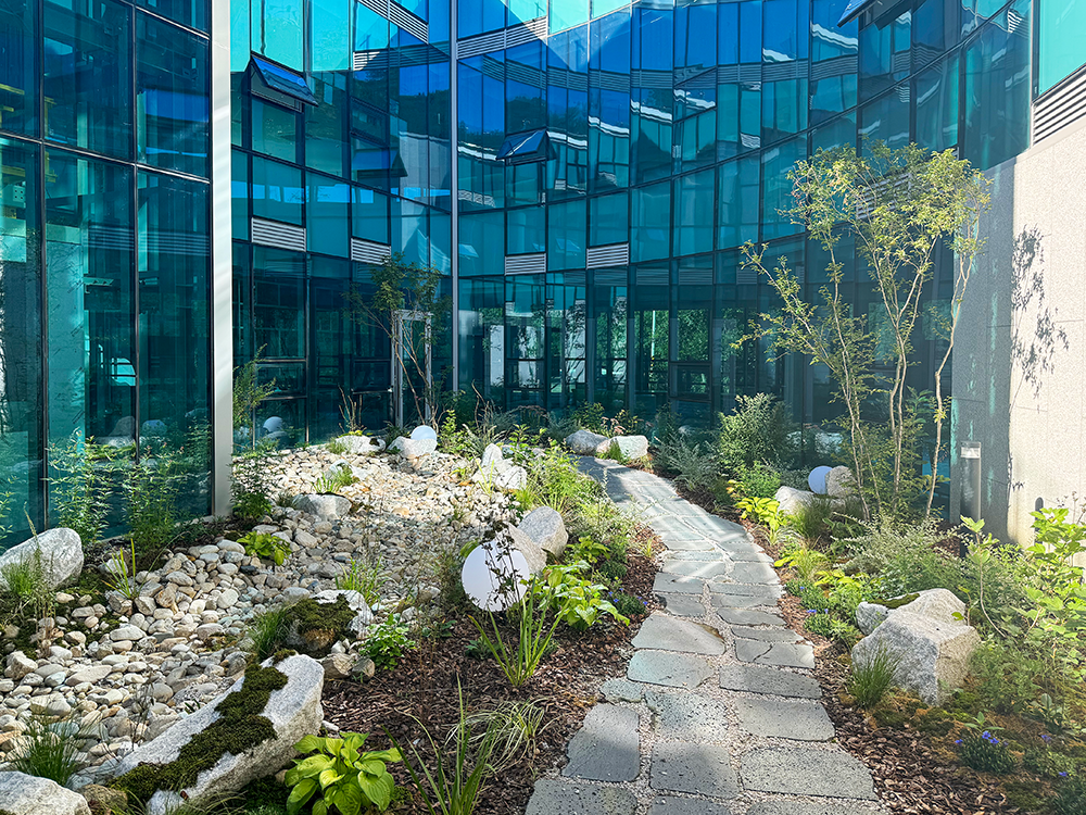 대지의 지형적 특성에 부합하는 반원형 매스(Mass)계획, 내부공간에서 자연으로의 시각적 확장과 곡선형 외관 이미지로 친근함을 구현했다. 내·외부 유기적 시각 연계를 위한 전면 통창 계획은 개방감과 적극적인 조망과 채광을 제공한다. 건축물 중심부 중정은 공간의 입체감을 더하며, 중정에 인접한 투시형 엘리베이터는 교감하는 공간감을 제공한다.