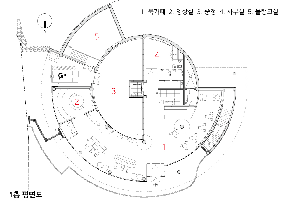 평면계획은 트렌드에 부합하는 기능을 수용하는 융통성을 제공하고, 전망공간으로서의 옥상정원과 접근하는 외부 반원형 경사로는 주변 자연경관을 드라마틱하게 경험하는 동적 시퀀스를 제공하며, 옥외경사로가 시작되는 햇빛마당은 구석진 곳에 활력을 제공한다. 건축물로 접근하는 연결다리는 주변 계곡을 극복하는 외부 동선의 기능 외에 접근에 대한 다채로운 시각적 시퀀스를 제공하며, 외부 공간을 더욱 입체적으로 경험하는 훌륭한 장치가 될 것이다.