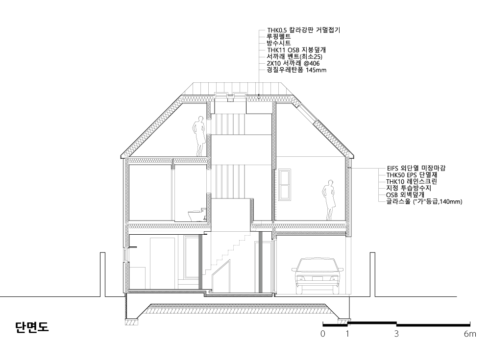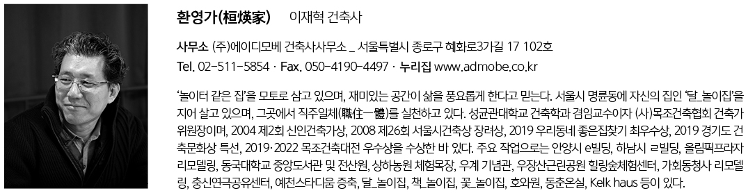 | 환영가(桓煐家) 설계자 | 이재혁 _ (주)에이디모베 건축사사무소 건축주 | 송인영, 백인환 감리자 | 이재혁 _ (주)에이디모베 건축사사무소 시공사 | 오철 _ 오에이치건설 설계팀 | 박기원, 장보혜 대지위치 | 경기도 수원시 장안구 조원동 주요용도 | 단독주택 대지면적 | 113.04㎡ 건축면적 | 60.25㎡ 연면적 | 111.15㎡ 건폐율 | 53.30% 용적률 | 77.45% 규모 | 3F 구조 | 일반목구조 외부마감재 | EIFS+준불연EPS 50mm, THK0.6 포스텍 리얼징크, PVC 시스템창호+thk43 삼증유리, PVC 미국식창호+thk35 삼증유리, VELUX GPL MK04, VS CK04, 커넬시스텍 알미늄 단열도어 내부마감재 | thk8 DM 메종 강마루, thk8 도기질타일, 내부용 테라코트, thk9 미송합판+투명 스테인, 라완합판+투명 스테인, 공틀, 계단재_thk18 미송 집성목+투명 스테인 설계기간 | 2022. 01 - 2022. 07 공사기간 | 2022. 08 - 2023. 04 사진 | 윤동규 구조분야 | 마영민 _ 금나구조 기계설비분야 | 김성률 _ 유영설비기술연구소 전기분야 | 김기표 _ 거산ENG |