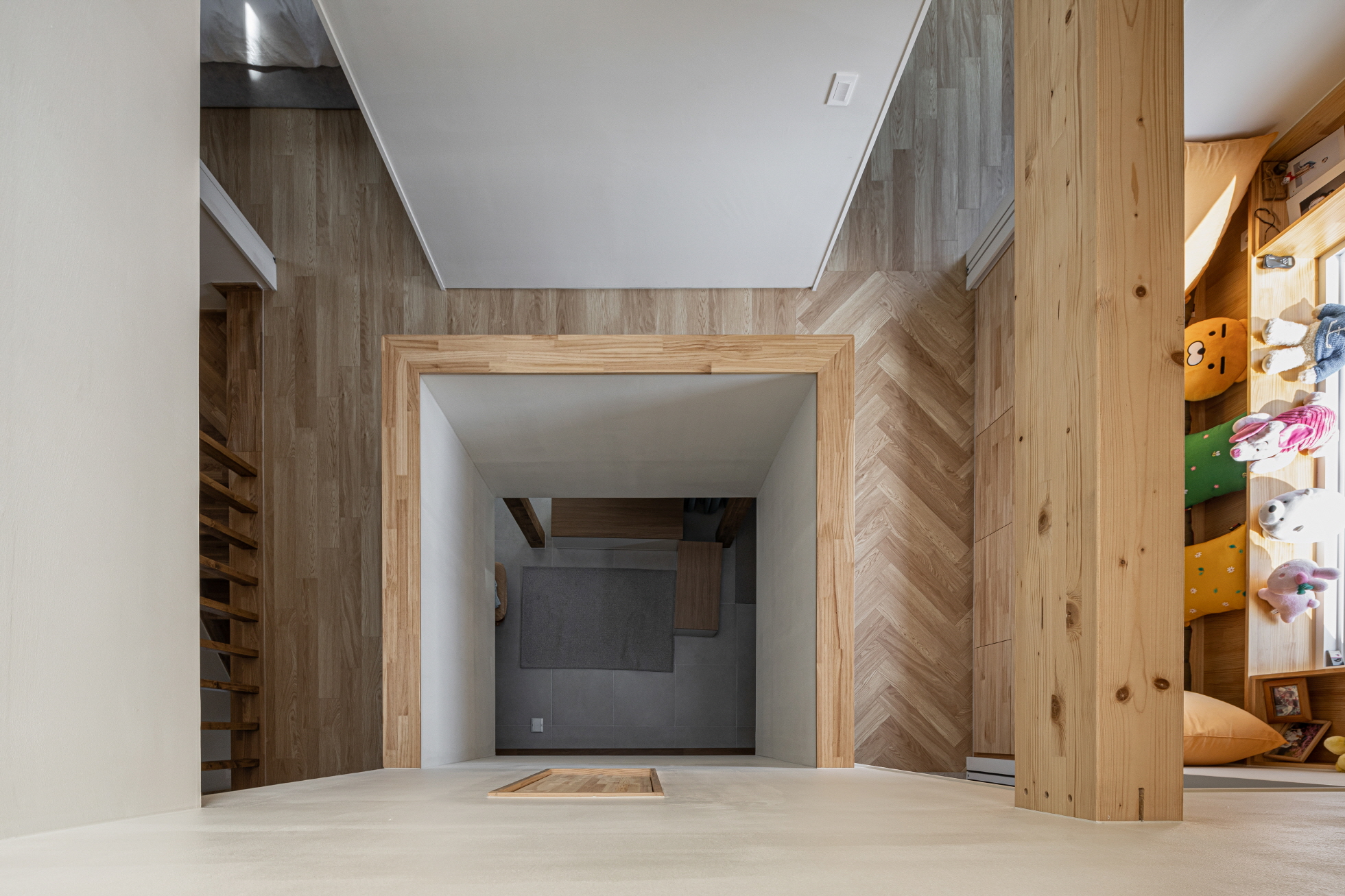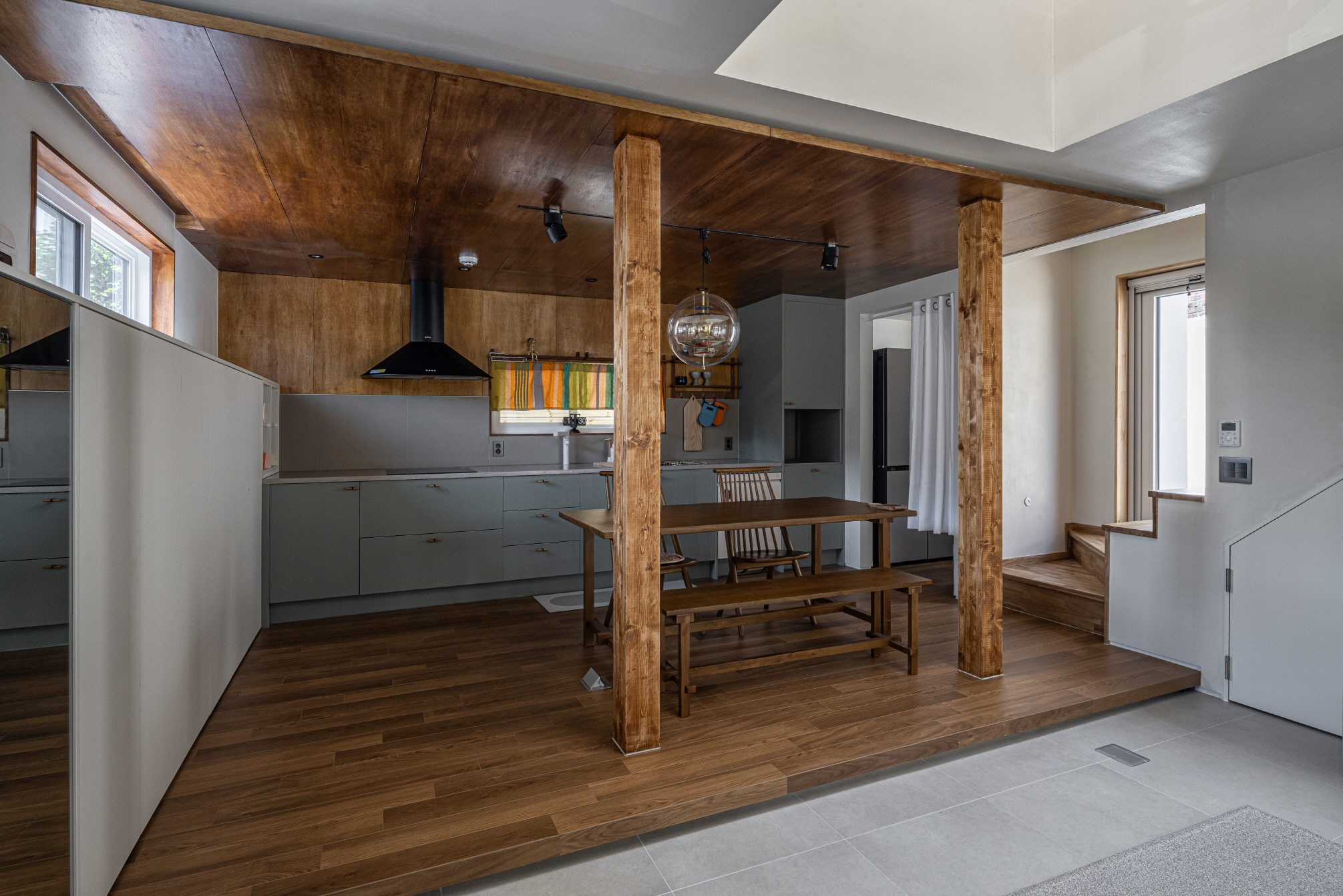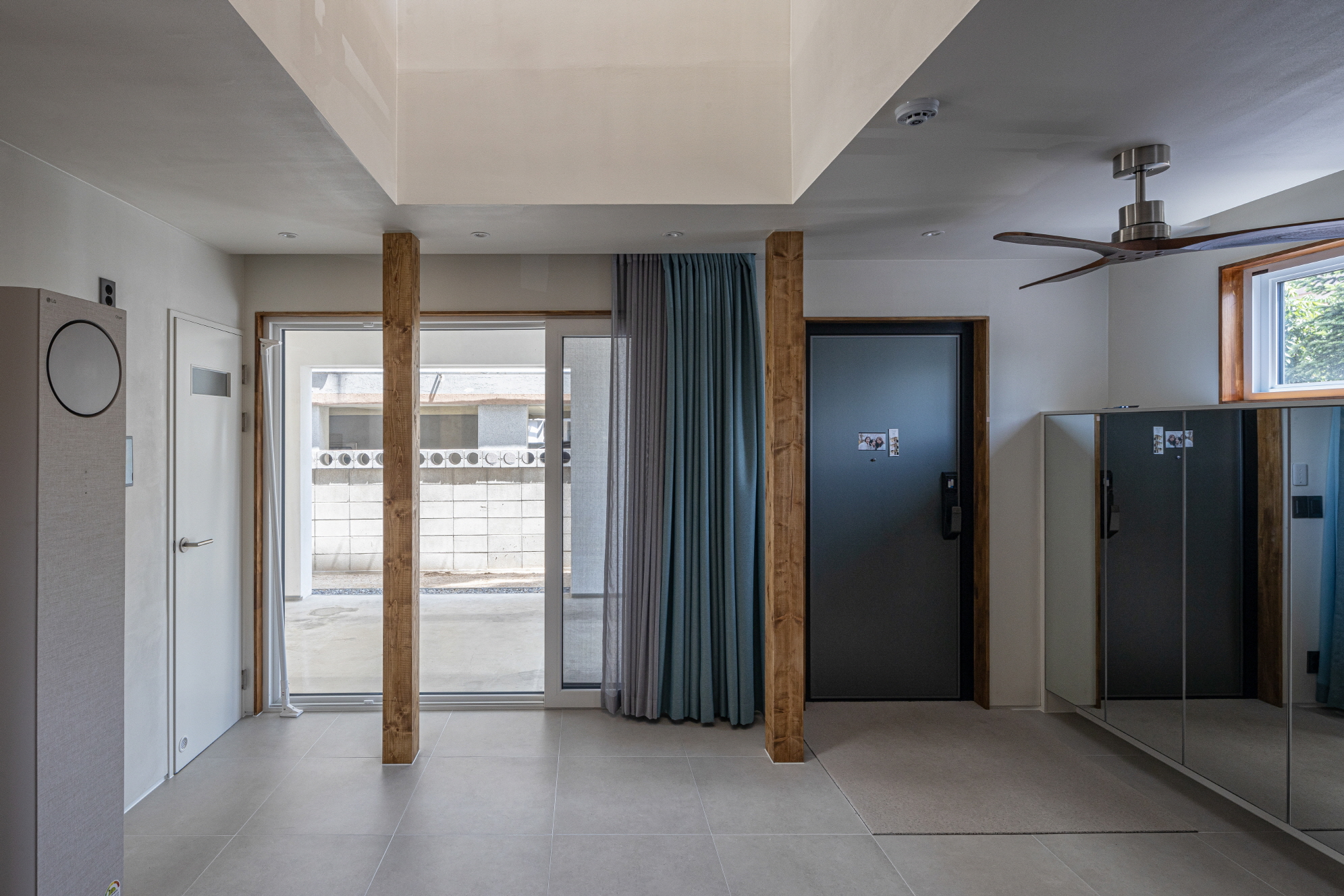The first floor of ‘Welcome House’ consists of a living room and kitchen. Uniquely, the entrance space where shoes are removed is spacious and doubles as the living room. The living room features tiled flooring, allowing plants to be grown in pots. A low platform separates the living room from the kitchen and dining area, where plywood was chosen as the finishing material. The floor and ceiling in this space were unified in similar tones to create a sense of distinction from the living room.