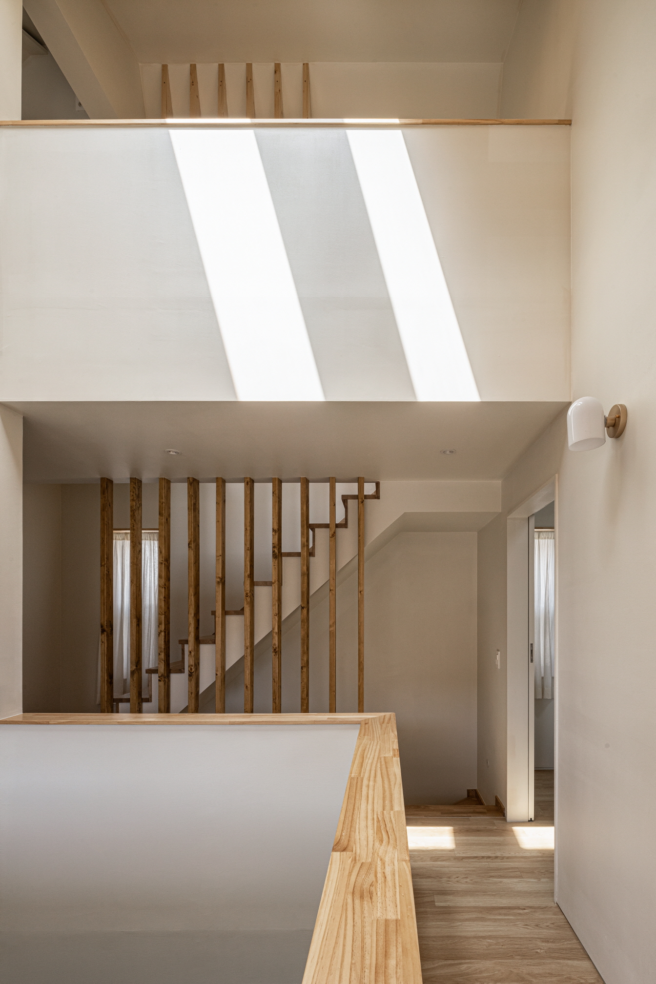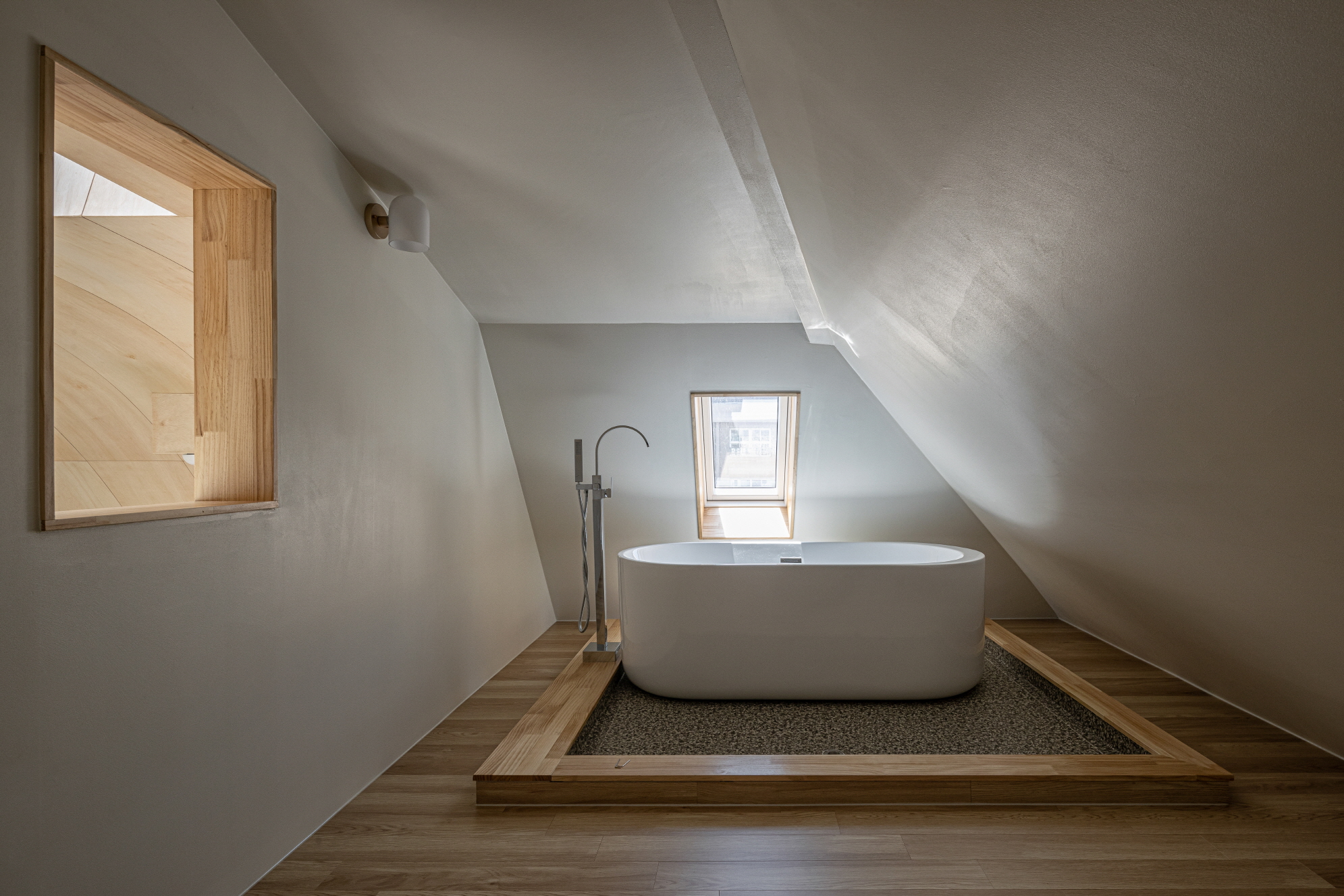 The third floor houses one room with a bathtub. The couple originally envisioned an outdoor terrace, but to balance costs and maintenance considerations, the space was enclosed, with a skylight installed nearby to create an outdoor ambiance. From the third floor, one can view the arch of the second floor and the living room below.