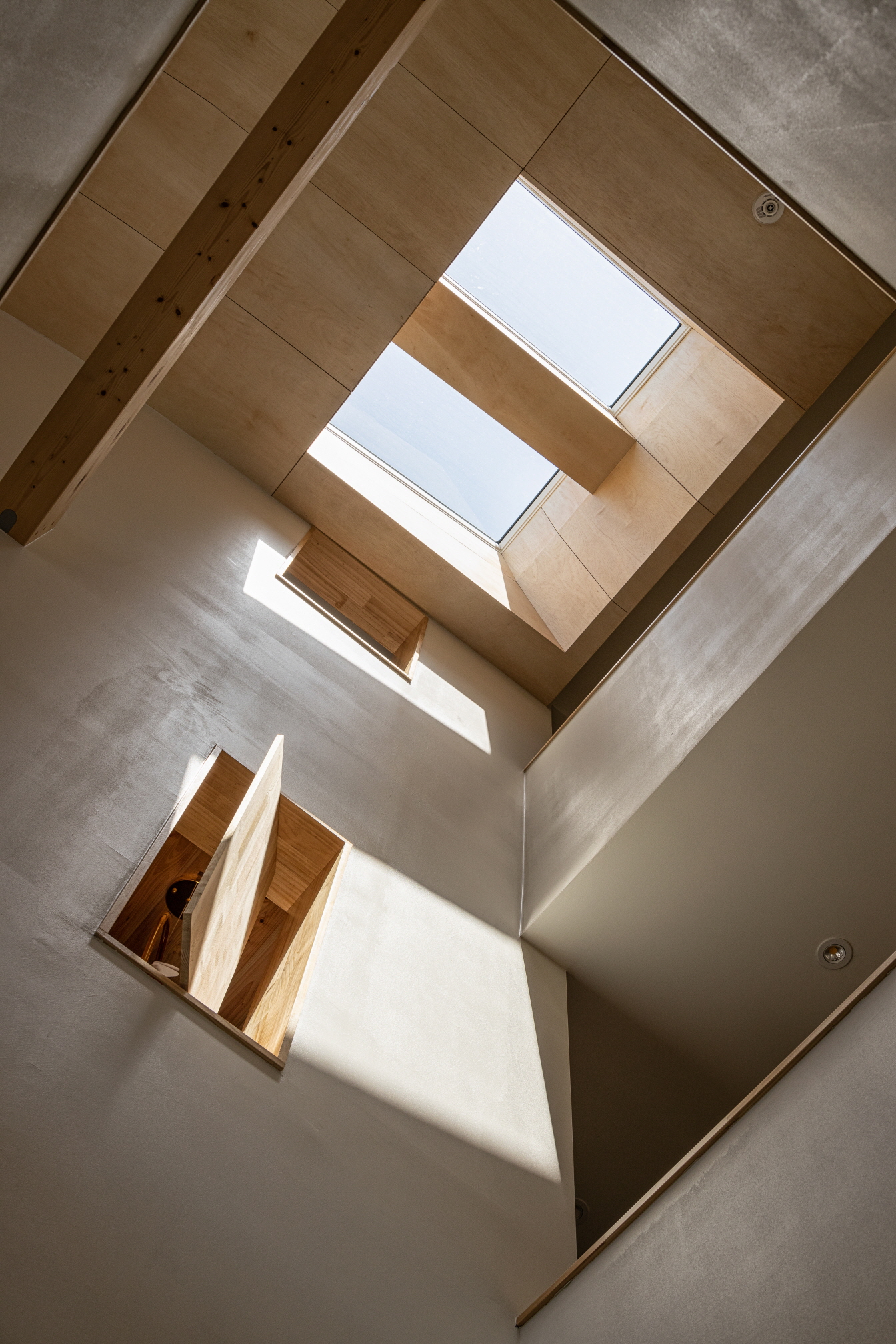 At the center of the first floor, four structural pillars rise, connecting to a skylight on the roof via a void that runs through the building’s core. This allows sunlight to cascade down from the roof to the first floor.