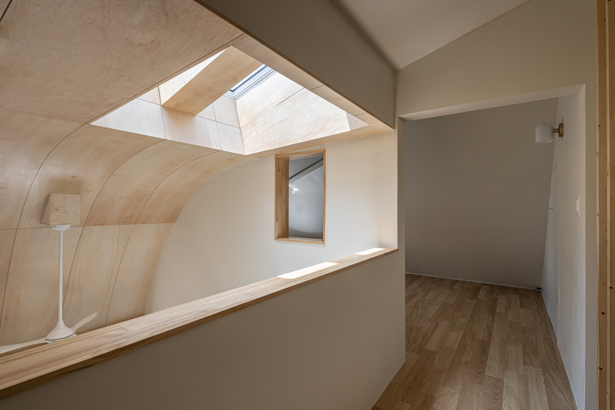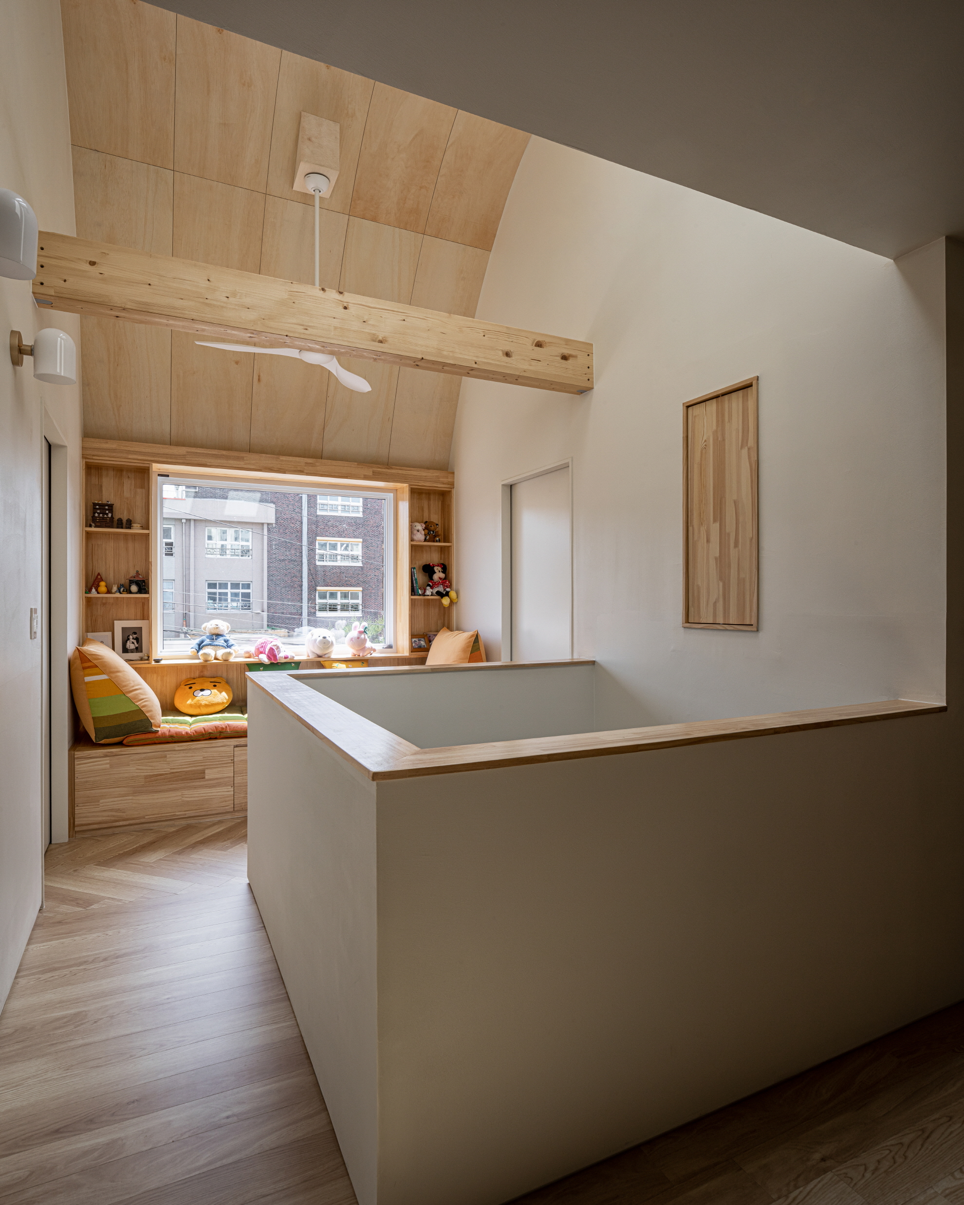 On the second floor, two rooms are located on the left, while the right side contains a dressing room area. The two rooms are connected with sliding doors, allowing them to function as a single space or as independent rooms, accommodating the future possibility of a child. The dressing room features a shower, toilet, washing machine, and powder room. On the southern side, a large window seat, named the ‘Terrace,’ provides a view of the entire house, including the rounded arch of the ceiling.