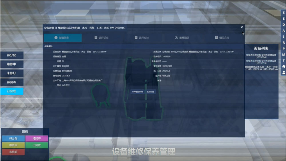 이러한 BIM관리 시스템의 기반은 중국에서 잘 활용되고 있는 QR코드를 이용한 모바일 APP과 3차원 BIM데이터를 이용한 VR, AR과 같은 미디어를 가지고 지하철 역사의 유지보수에 관한 모든 단계의 추적 관리가 가능하게 되었다. 다음은 쿤밍 지하철 BIM 운영관리 시스템의 설비부분에 관한 데이터 관리를 보여주는 사례이다.