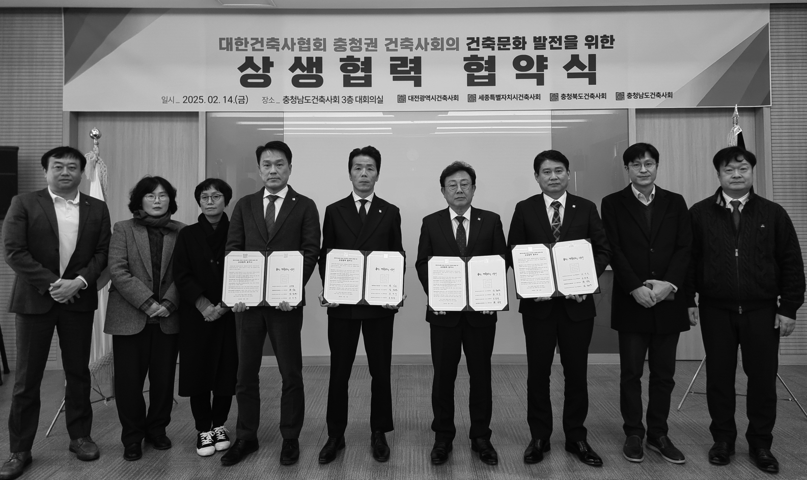 대한건축사협회 충청권건축사회(대전·세종·충북·충남) 회장단은 2월 14일 충청남도건축사회 3층 대회의실에서 대전광역시건축사회 조한묵 회장, 세종특별자치시건축사회 현상훈 회장, 충청북도건축사회 김종도 회장, 충청남도건축사회 한민규 회장, 대전광역시건축사회 임재현 부회장 등 각 시·도 사무처장이 참석한 가운데 충청권 건축문화발전을 위한 상생협력업무협약을 가졌다.