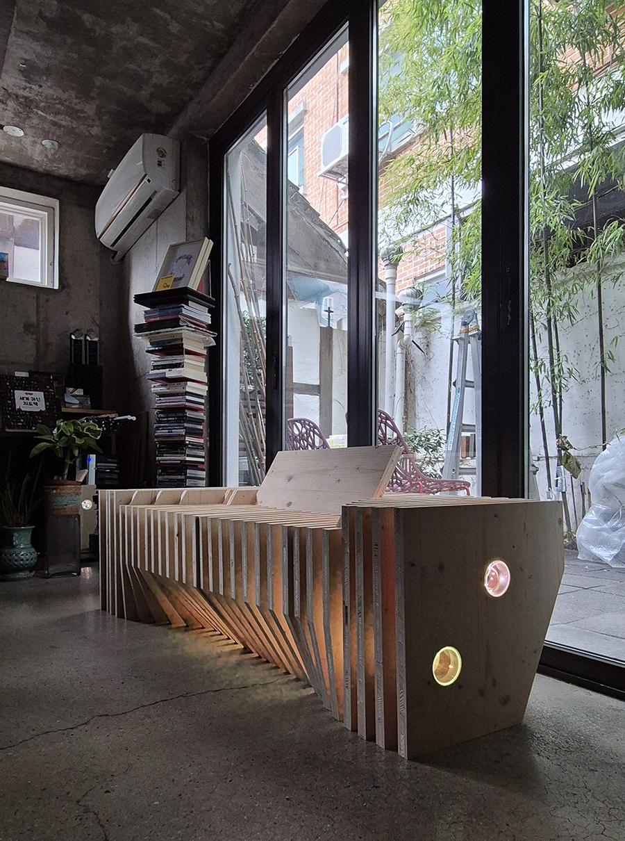 박정연 건축사는 900x2400 크기의 합판 한 장을 재단해 버려지는 부분을 최소화한 의자를 만들었다. 쉽고 간단한 방법으로 의자를 만들겠다는 생각에서 출발한 ㄱㄱㅁ의자는 적절한 크기로 수평의 앉는 부분을 만들고 수직의 부재 4개가 다리와 등받이가 되도록 구성됐다. 이를 병렬 배치하면 자연스럽게 여러 명이 함께 앉을 수 있는 의자가 된다. 재료를 효율적으로 사용하면서도 단순한 형태의 의자다.