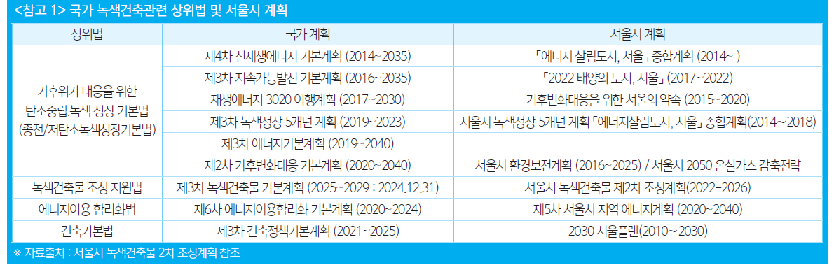 「녹색건축물 조성 지원법」 제7조 및 동법 시행령 제5조에 따라 시·도지사는 국토교통부가 수립·시행하는 ‘녹색건축물 기본계획’에 부합되도록 지역 녹색건축물 조성 지원계획을 수립 시행하도록 되어 있다. 이에 따라 서울시는 2030년까지 온실가스 배출량을 2005년 대비 40% 감축 목표를 설정하고, ‘시민과 함께하는 녹색건축 활성화’를 위해 5년 단위의 ‘제2차 녹색건축물 조성계획(2022-2026)’을 수립·시행하고 있으며, 이외에도 「기후위기 대응을 위한 탄소중립·녹색성장 기본법」 등 녹색건축 관련 법령 및 국가 계획에 따른 서울시 계획을 수립 시행하고 있다.