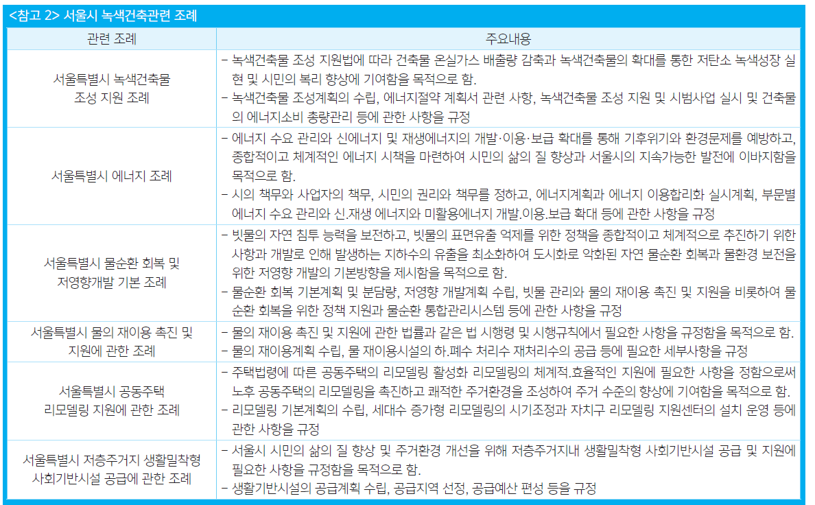 또한, 서울시는 다른 지역에 비해 건물부문의 온실가스 배출 비중이 높아 국토교통부의 ’건축물 에너지절약 설계기준‘보다 상향된 ’서울시 녹색건축물 설계기준‘을 적용하여 다른 자치단체에 비해 가장 높은 건축물 성능수준을 요구하고 있으며, 녹색건축 관련 조례로는 녹색건축물 조성 지원조례, 에너지 조례, 물순환 회복 및 저영향개발 기본조례 등이 제정 운영되고 있다.