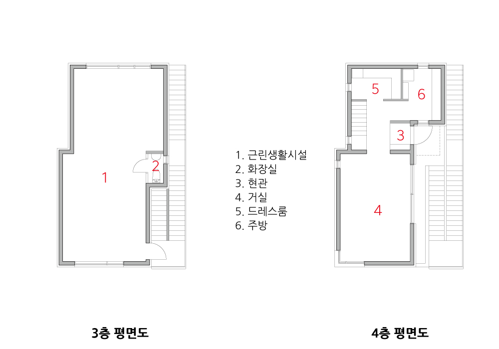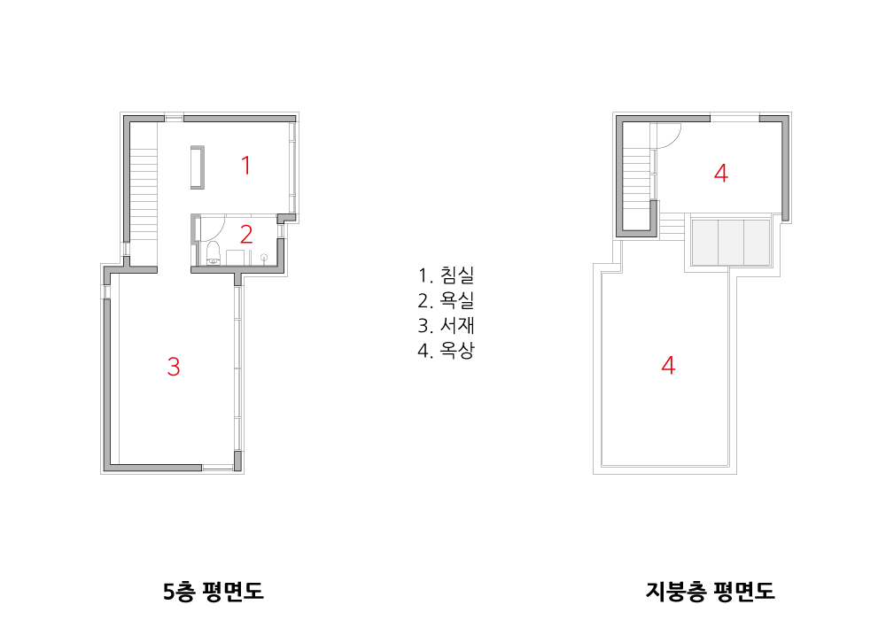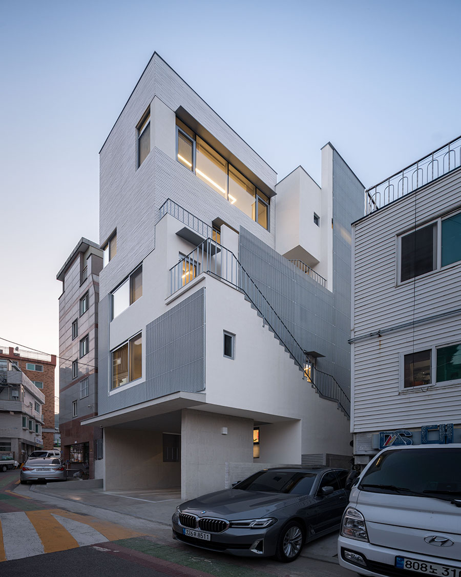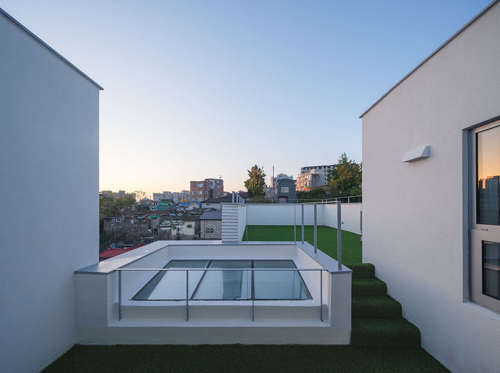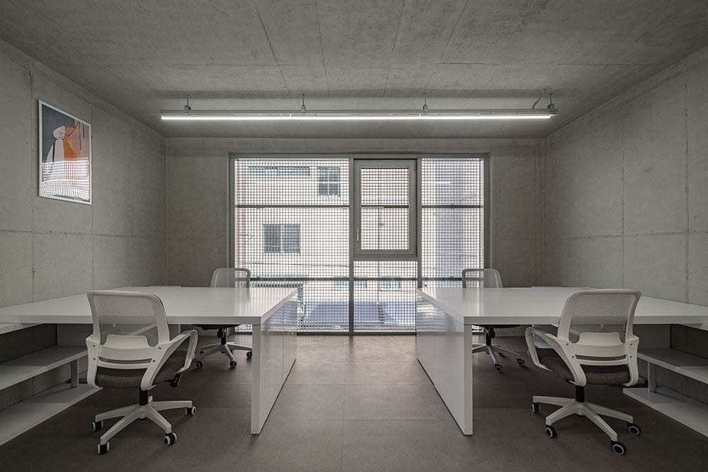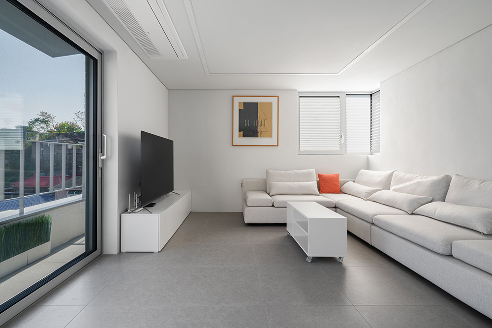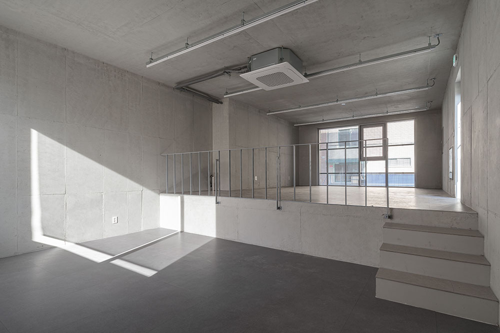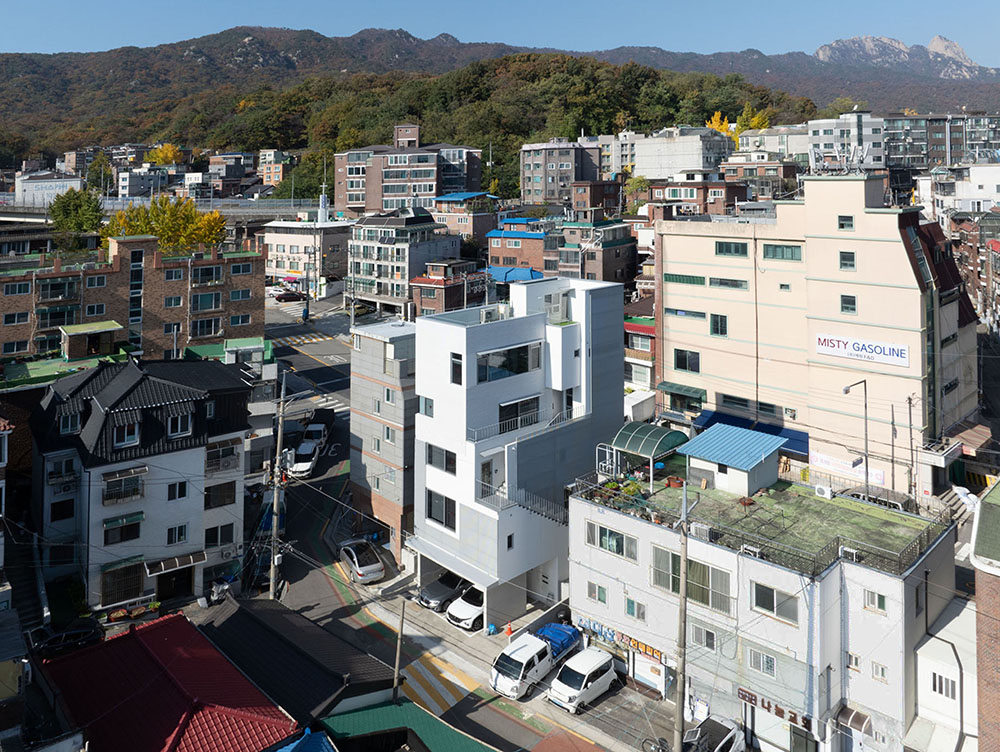 창과 외벽에 대한 아이디어는 자연스럽게 주거공간에 대한 재해석으로 이어졌다. 이 건물은 4, 5층이 주택이며 내부에서 계단으로 연결된 2개 층을 한 세대가 사용한다. 대지의 조건 상 수평적으로 공간을 확장하는 것에 한계가 있었기에 거주공간을 수직으로 구성했다. 그러나 흔히 주택을 설계할 때처럼 필요한 방의 개수로 공간을 구획하는 것이 아니라, 방과 문을 없애고 최소한의 벽체로 공간을 구분함으로써 미술관과 같은 공간적 재미를 유도했다.