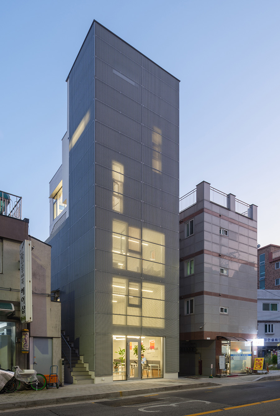 도로와 건물의 경계에는 창문 한 겹이 있다. 이 한 겹의 창을 조금 더 효과적으로 만들어 줄 무언가가 필요하다고 생각했다. 그러던 중 창과 외벽에 하나의 레이어를 덧붙이는 아이디어가 떠올랐다. 차양처럼 빛을 조절하면서 내부의 거주성을 확보할 수 있는 레이어, 건물의 얼굴을 만들면서 빛과 프라이버시를 조절할 수 있는 레이어가 그것이다. 이 레이어를 위해 FRP 그레이팅을 선택했다.