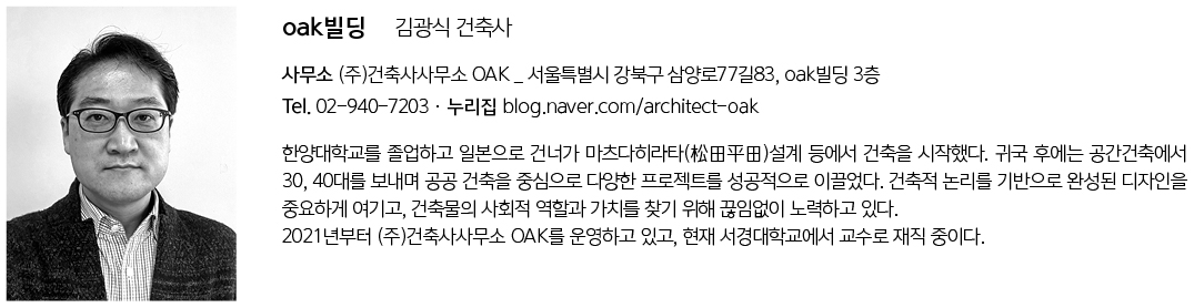 | oak빌딩 설계자 | 김광식 _ (주)건축사사무소 OAK · 서경대학교 감리자 | (주)건축사사무소 OAK 시공사 | (주)제이종합건설 대지위치 | 서울특별시 강북구 삼양로77길83 주요용도 | 근린생활시설, 주택 대지면적 | 110.00㎡ 건축면적 | 65.74㎡ 연면적 | 219.35㎡ 건폐율 | 59.76% 용적률 | 199.42% 규모 | 5F 구조 | 철근콘크리트구조 외부마감재 | 외단열시스템, FRP그레이팅, 롱브릭타일 내부마감재 | 노출콘크리트, 포세린타일 설계기간 | 2023. 10 – 2024. 02 공사기간 | 2024. 04 – 2024. 10 사진 | 김용성 구조분야 | (주)도시구조안전 기계설비분야 | (주)대아엠앤씨 전기분야 | (주)한양전설 소방분야 | (주)한양전설, (주)대아엠앤씨 |