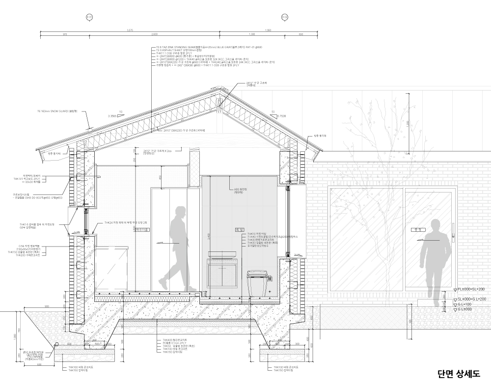 | 작소비가(作小卑家) _ 작아서 소중하고 비울수 있어 가치로운 설계자 | 하상준 _ 건축사사무소 공백 건축주 | 홍기봉, 유운미 감리자 | 하상준 _ 건축사사무소 공백 시공사 | 최원준 _ 월튼네사람들 대지위치 | 강원특별자치도 정선군 북평면 남평강변로 214-9 주요용도 | 단독주택 대지면적 | 876.90㎡ 건축면적 | 125.72㎡ 연면적 | 125.19㎡ 건폐율 | 14.34% 용적률 | 14.28% 규모 | 1F 구조 | (철근콘크리트조 + 경량목조지붕틀) 드림구조 외부마감재 | 벽 _ 점토벽돌 (삼한C1 : SH3238 블랙토담) 지붕 _ 알루미늄 불소수지 도장 강판 0.7T 돌출이음 창호 _ 알루미늄 시스템 창호(위드지스) 내부마감재 | 벽 _ (소나무황토벽지 2212-27 52.)EDEN BIO 마루 _ 치장목질마루판 (165*7.5T*1200블랙라벨 블랑오크+황토접착제) NOVA 타일 _ PORCELAIN GEA (600*1200*6.5T) INOLA ITALY 윤현상재 설계기간 | 2021. 08 – 2022. 03 공사기간 | 2022. 08 – 2023. 03 사진 | 최진보 구조분야 | 김민관 _ 드림구조 기계설비·전기·소방분야 | 하상준 _ 건축사사무소 공백 |