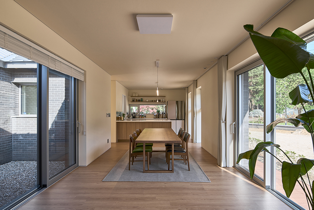 At the center of the house is a small courtyard, serving as a reference point. On either side, the room with a sofa and TV (living room) and the room with an eight-person dining table (dining room) face each other. Beyond these rooms, one can hear the flowing waters of the Odaechon River and see the trees of Gariwangsan swaying in the wind. If the partition between the kitchen, dining room, and master bedroom is removed, the space transforms into a large sarangchae (main gathering room), where everyone can gather and dine while enjoying the view of the courtyard. If the partition of the opposite room is opened, the vivid red foliage of a Japanese maple courtyard serves as a natural backdrop, creating an intimate space for conversation—a small sarangchae. Each of these rooms remains independent yet can be seamlessly merged, forming a sequence of undefined, open spaces.