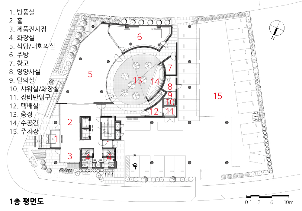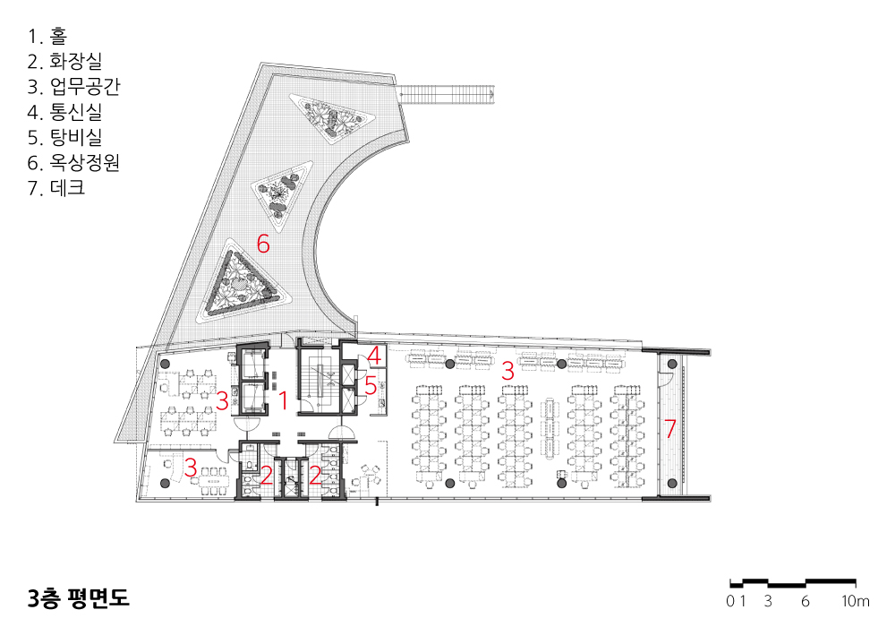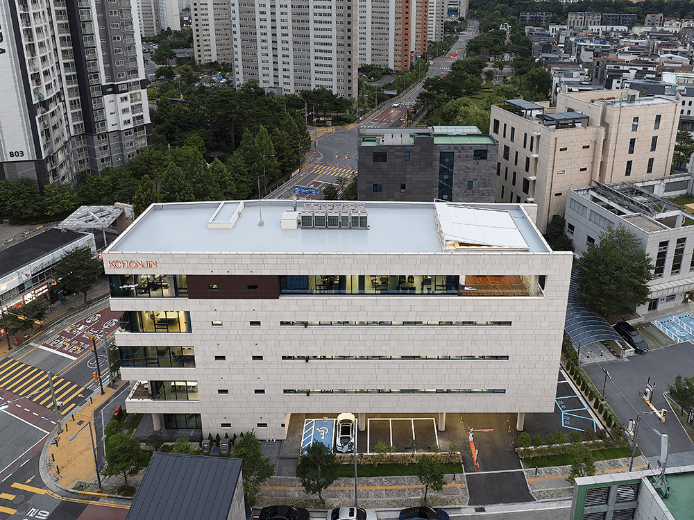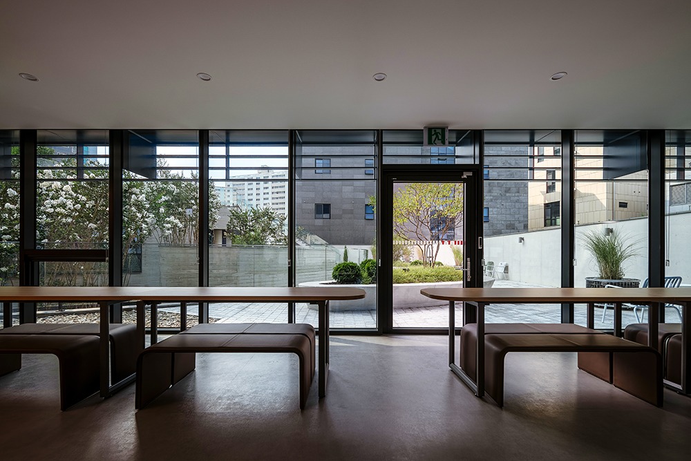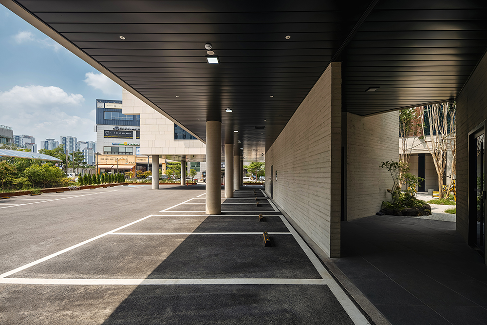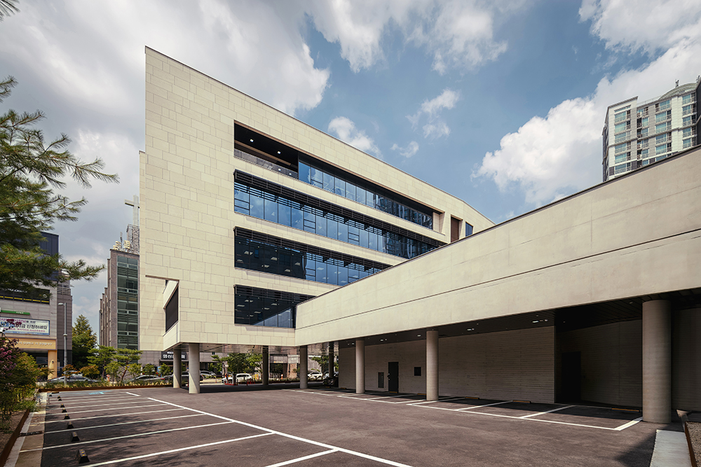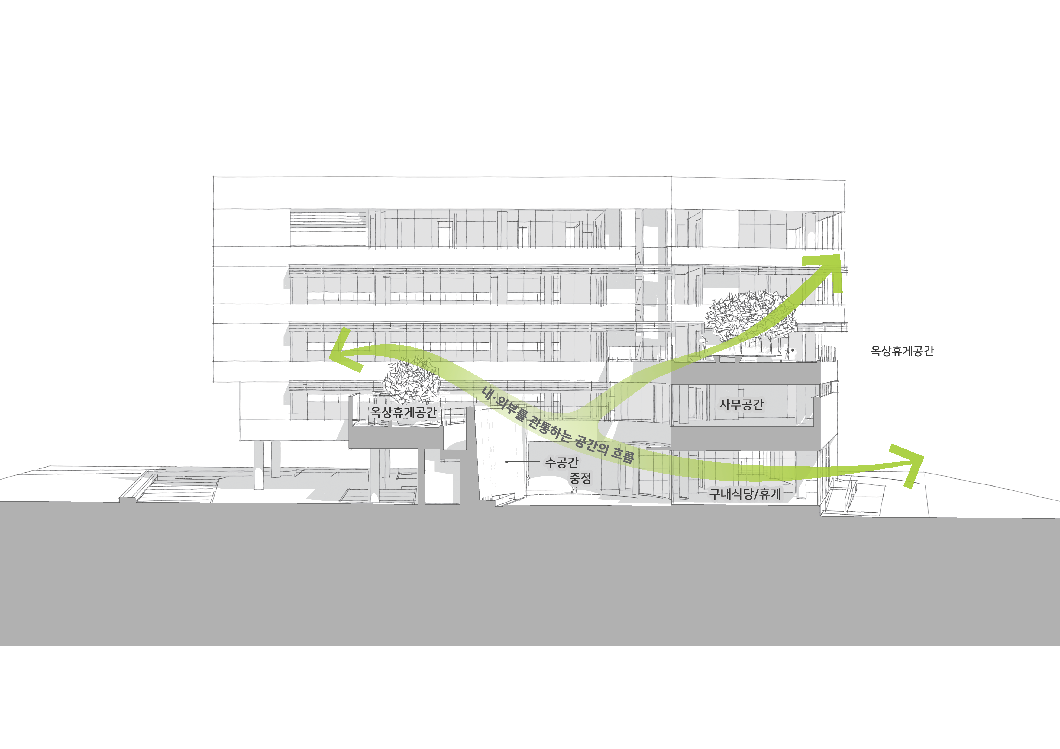 전면의 큰 도로에 면해서 구내식당과 중정, 옥상 조경이 위치한 노출콘크리트 마감의 2층 높이 볼륨을 배치했고, 거기에 북측 도로변으로 5층 높이의 석재마감 사무동을 코어를 중심으로 연결했다. 이 배치는 아파트 단지에서의 시각적 부담을 줄여주고, 이웃 건물로 인해 드리워지는 그림자를 피해 사무공간에 남쪽 빛을 제공할 수 있게 한다.