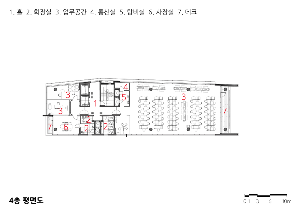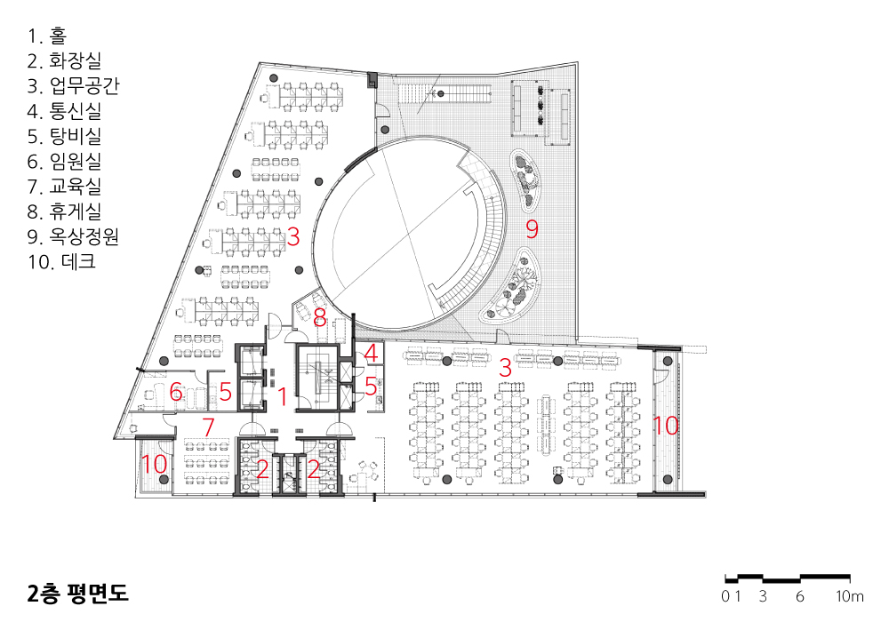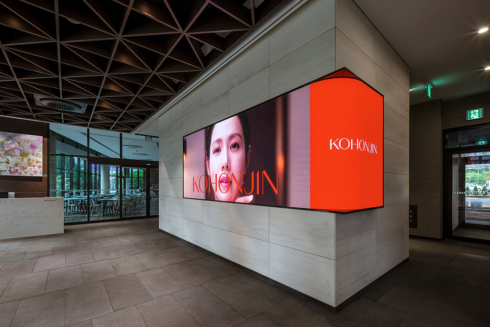 프리미엄 화장품을 온라인으로 판매하는 회사의 특성상 팀장 1명과 팀원 10명이 한 단위로 구성되어 여러 팀으로 이루어진다. 주 업무는 전화상담이고 구성원은 대부분 여성이다. 업무 스트레스를 풀 수 있도록 2층과 3층에 조경을 접할 수 있는 옥상 휴게공간을 직접 연결했고, 구내식당에서는 키 큰 배롱나무와 시원한 물줄기가 떨어지는 타원형 중정을 바라보며 식사와 차를 즐길 수 있게 했다. 이는 사원들에게 즐겁게 일할 수 있는 환경을 제공하고자 하는 오너의 의지가 담겨있는 장치들이다.