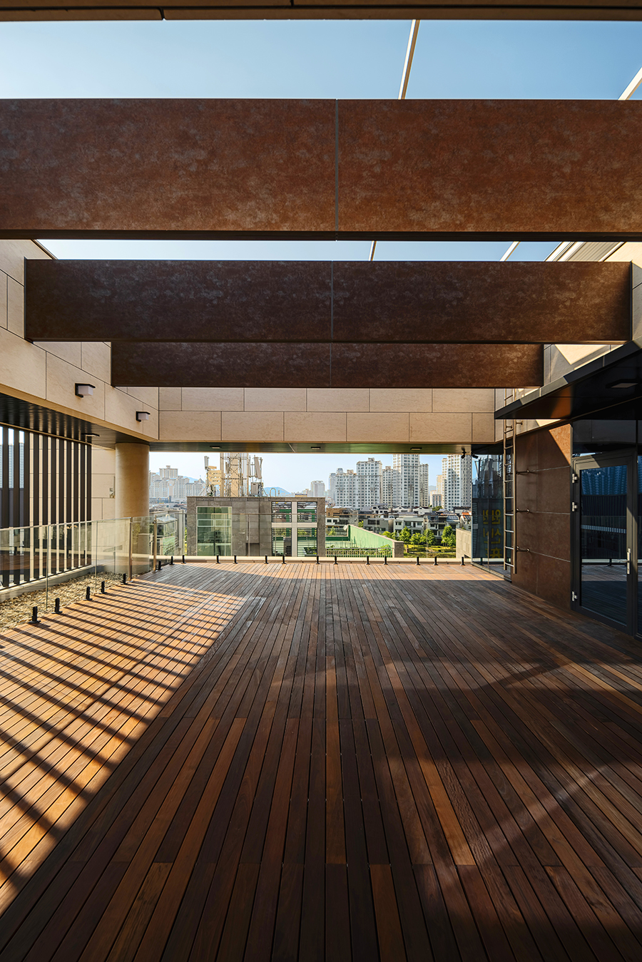 Facing the main road, a two-story exposed concrete volume houses the cafeteria, courtyard, and rooftop garden. Connected to this structure, a five-story office building with a stone facade extends along the northern road, linked by a core. This layout reduces the visual impact from the apartment complex, while also minimizing shadows cast by adjacent buildings, ensuring ample southern light for the office spaces.