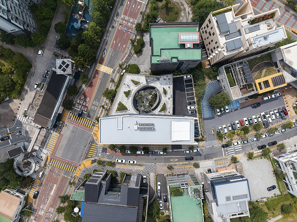 전면의 큰 도로에 면해서 구내식당과 중정, 옥상 조경이 위치한 노출콘크리트 마감의 2층 높이 볼륨을 배치했고, 거기에 북측 도로변으로 5층 높이의 석재마감 사무동을 코어를 중심으로 연결했다. 이 배치는 아파트 단지에서의 시각적 부담을 줄여주고, 이웃 건물로 인해 드리워지는 그림자를 피해 사무공간에 남쪽 빛을 제공할 수 있게 한다.