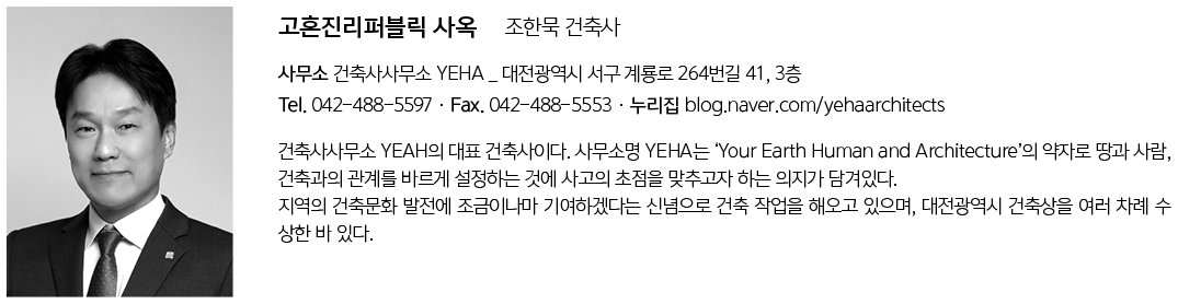 | 고혼진리퍼블릭 사옥 설계자 | 조한묵 _ 건축사사무소 YEHA 건축주 | 주식회사 고혼진리퍼블릭 감리자 | 조한묵 시공사 | 궁도건설주식회사 설계팀 | 안혜영, 조현아 대지위치 | 대전광역시 유성구 봉명로 43 주요용도 | 업무시설 대지면적 | 2,045.30㎡ 건축면적 | 1,010.04㎡ 연면적 | 2,836.03㎡ 건폐율 | 49.38% 용적률 | 129.06% 규모 | B1F - 5F 구조 | 철근콘크리트구조 외부마감재 | 노출콘크리트, 석재 내부마감재 | 인테리어마감 설계기간 | 2021. 04 - 2022. 11 공사기간 | 2022. 12 - 2024. 06 사진 | 천영택 구조분야 | 단구조 기계설비분야 | 삼인설비 전기분야 | 좋은전기 |