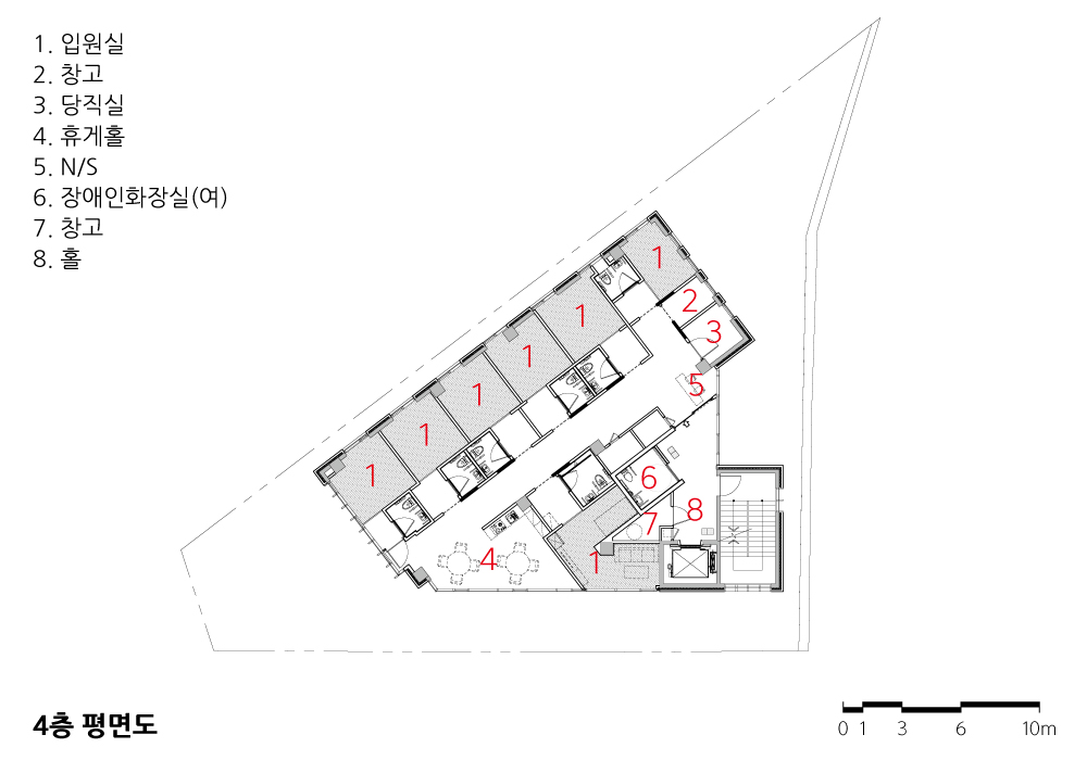 접근성이 좋은 1층에 카페 임대공간이 있으며, 지하 2층의 직원식당과 사무공간을 제외한 나머지 모든 층은 환자들을 위한 공간으로 구성된다. 지하 1층의 보청기센터, 2층 외래진료공간, 3층 청각재활센터, 4층 입원실 ZONE, 5층 수술센터 및 어지럼증센터, 6층 소리 아카데미 홀, 그리고 옥상의 휴게정원으로 이어진다.