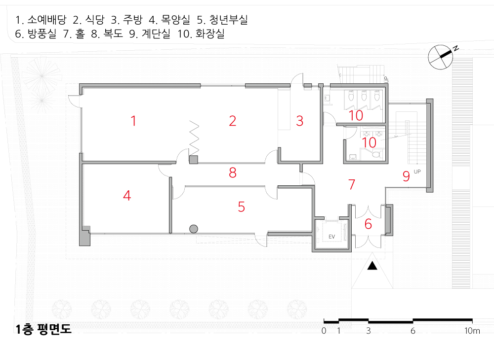 The first floor is a flexible space for community and educational use, supporting both religious activities and gatherings. It includes a pastor’s office, youth room, dining hall, and a small chapel. The corridor between the youth room and dining area is enclosed in glass, visually connecting the interior to the courtyard and encouraging interaction.
