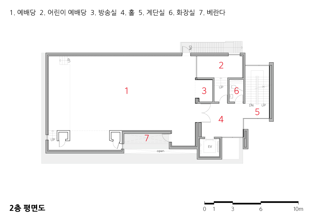 교회 1층은 종교 활동을 보조하고 교육, 강연 등 다목적으로 사용 가능한 공간이다. 목양실, 청년부실과 식당, 소예배당을 배치해 모임과 친교를 위한 공간으로 계획되었다. 청년부실과 식당 사이 복도는 유리월로 계획해, 식당에서 마당까지 시각적으로 열려 소통하는 공간이 되도록 했다. 2층에는 예배당이 위치한다. 기존 교회의 박공 지붕을 예배당 내부에 노출콘크리트 박공 천장으로 담고, 벽은 따뜻한 색감의 우드톤 흡음 보드로 마감했다. 파노라마로 펼쳐진 풍광을 향해 열린 베란다를 예배당 동측면에 계획하여, 실내로 자연광을 은은하게 유입하고 자연의 변화를 내부에서도 느낄 수 있도록 했다. 3층은 목사님 부부를 위한 사택이 위치한다. 남측으로 배치한 개방감 있는 전면창 밖으로 콘크리트 지붕과 근경, 원경에 나지막하게 펼쳐진 자연이 겹쳐지며 평온한 분위기가 연출된다.