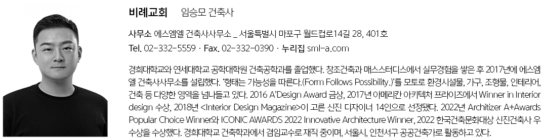 Birye Church Architect | Lim, Seung Mo _ SML Client | Birye Church Supervisor | Oh, Ilseok Construction | Juseong E&C Project team | Kim, Jiyoon Design intention realization | SML Location | Golmal-gil, Chubu-myeon, Geumsan-gun, Chungcheongnam-do, Korea Program | Religious facilities, Detached house Site area | 1,137.00㎡ Building area | 302.65㎡ Gross floor area | 664.57㎡ Building to land ratio | 26.62% Floor area ratio | 58.45% Building scope | 3F Structure | RC Exterior finishing | Exposed concrete, Corrugated concrete Interior finishing | Exposed concrete, Paint Design period | Apr. 2023 – Aug. 2023 Construction period | Sep. 2023 – Sep. 2024 Photograph | Lee, Namsun Structural engineer | Todam Partners Mechanical·Electrical·Fire engineer | Joeun Engineering |