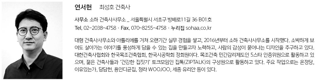 | 연서헌(嬿屖軒) 설계자 | 최성호 _ 소하 건축사사무소 건축주 | 고재일 시공사 | 브랜드하우징 설계팀 | 신승용 설계의도 구현 | 소하 건축사사무소 대지위치 | 경기도 양평군 개군면 개군산로 주요용도 | 단독주택 대지면적 | 875.00㎡ 건축면적 | 173.92㎡ 연면적 | 173.92㎡ 건폐율 | 19.88% 용적률 | 19.88% 규모 | 1F 구조 | 경골목구조 외부마감재 | 무소음 칼라강판 내부마감재 | 벤자민무어 스커프엑스 무광(Cloud White OC-130), 구정 원목마루 설계기간 | 2023. 07 – 2023. 11 공사기간 | 2023. 11 – 2024. 05 사진 | 이한울 구조분야 | 제쓰(ZESS)연구소 기계설비·전기분야 | 소하 건축사사무소 |
