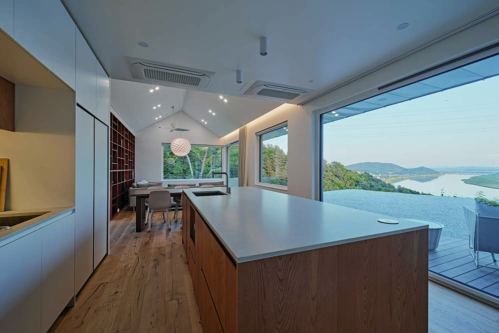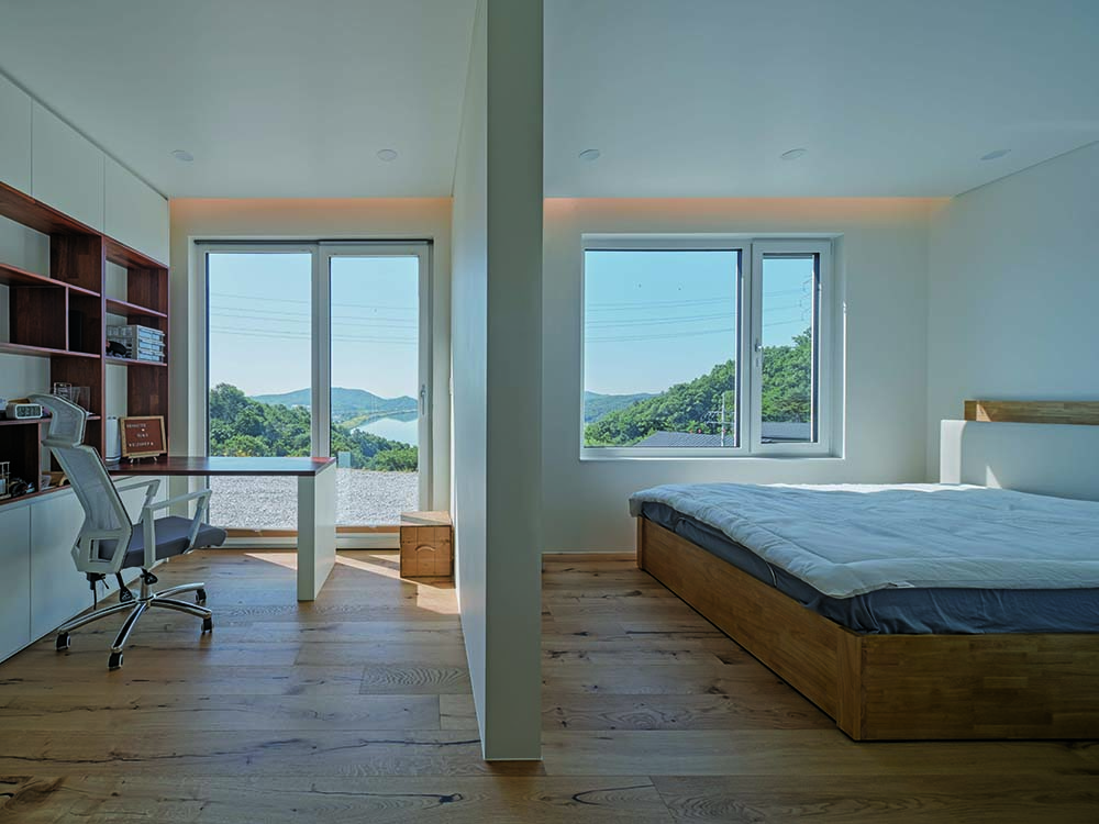 공용공간은 남한강을 조망할 수 있도록 배치되었으며, 넓은 개구부를 통해 자연을 내부로 들여온다. 반면, 침실과 드레스룸은 보다 아늑한 분위기를 조성하도록 창의 크기와 방향을 조절하여 설계했다.