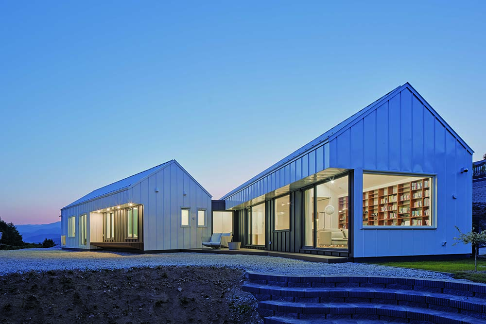Respecting the topography and location, the house was designed as a single-story structure composed of two masses connected together. Positioned at the lowest part of the development, the house avoids standing out, instead opting for a light timber structure with sloped roofs that blend seamlessly with the surrounding environment.