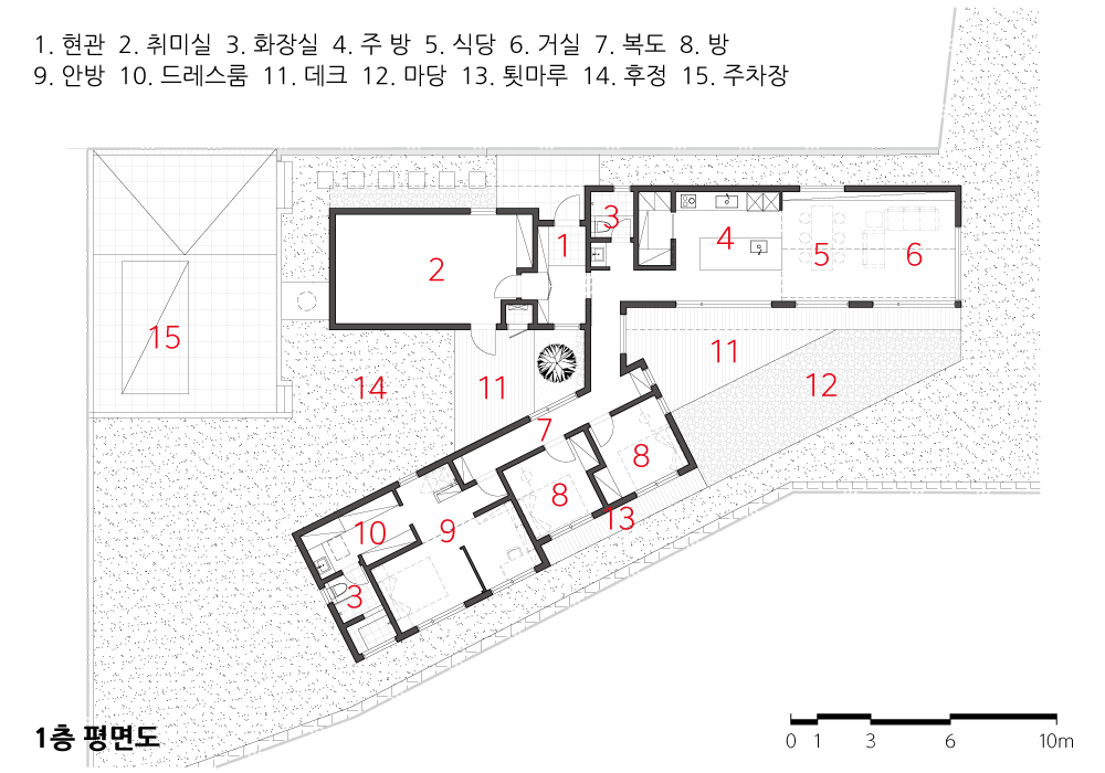 거실과 주방-식당은 외부 테크와 자연스럽게 연결되며, 실내에서도 확장된 공간감을 제공한다. 이러한 배치는 내부에서 이동할 때마다 변화하는 풍경을 경험할 수 있도록 의도된 것이다. 후정과 취미실은 단순한 부가적 공간이 아닌, 공용공간과 사적공간을 넘나드는 성격으로 공간을 유기적으로 연결하는 매개체 역할을 한다. 공용공간과 사적공간을 명확히 구분하면서도 후정과 취미실을 통해 유기적인 연결성을 유지했다. 또한, 남측 차양과 고효율 설비를 적용해 실내의 쾌적함을 극대화하고, 멀바우 책장 등을 활용해 실내에 따뜻한 감성을 더했다.