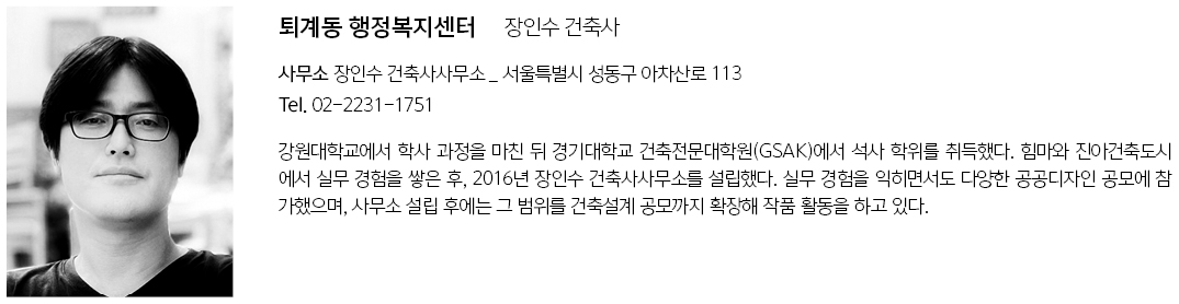 Toegye-dong Community Center Architect | Zang, Insoo _ Zanginsoo Architects, Shim, Soonbo _ Simmi Architecture & Engineering Client | Chuncheon City Supervisor | Yudeok Architects Inc. Construction | THE ONE General Construction co., Ltd. Project team | Lee, Jaewoong Design intention realization | Zanginsoo Architects Location | Namchun-ro, Chuncheon-si, Gangwon-do, Korea Program | Public Office Site area | 3,341.11㎡ Building area | 1,604.32㎡ Gross floor area | 4,988.53㎡ Building to land ratio | 48.02% Floor area ratio | 80.48% Building scope | B1F - 4F Structure | RC+S+SRC Exterior finishing | Low-E Glass, M-Bar Interior finishing | Paint finish above Gypsum board Design period | Jun. 2020 - May 2021 Construction period | Jun. 2021 - Jul. 2024 Photograph | Park, Woojin Structural engineer | Won Structural Engineering Mechanical·Electrical·Fire engineer | Osung Engineering & Construction |