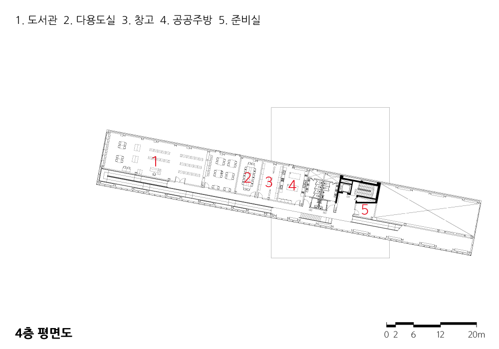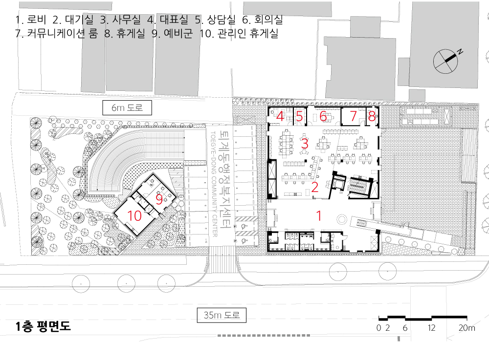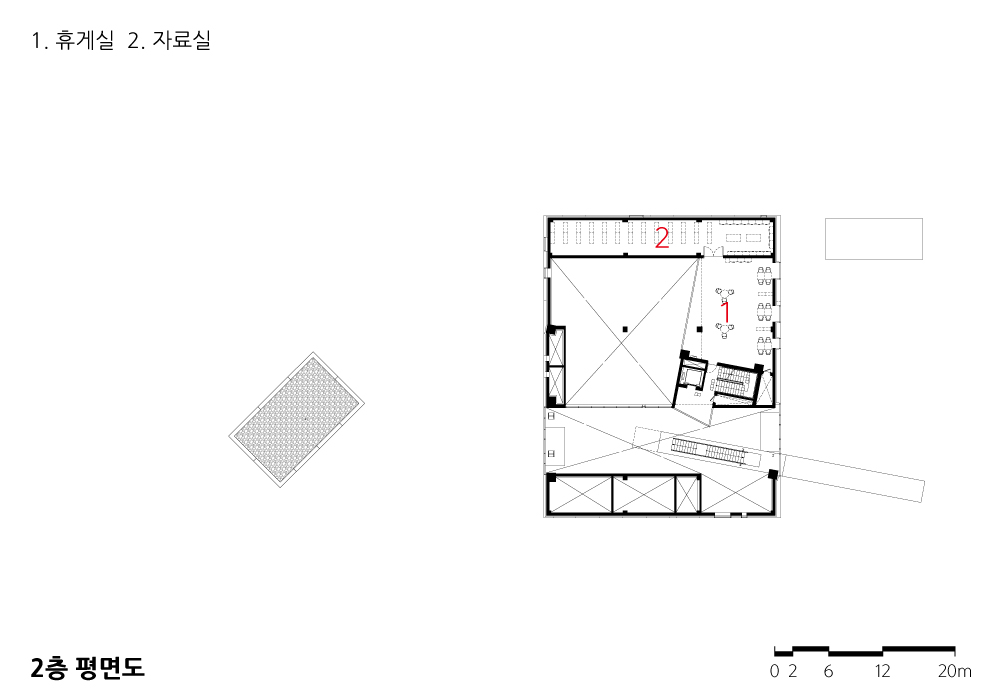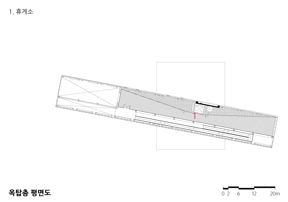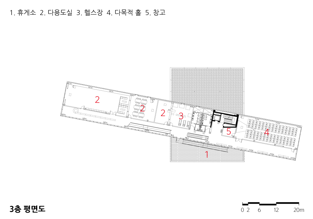The community center, which emerged as a dynamic composition of simple geometry, is a “Pragmatic Monument” that fulfills both symbolism and function, signaling the beginning of rediscovery and renewal of the site and surroundings, and strengthening the publicness of the site and architecture through open relationships with the surroundings.